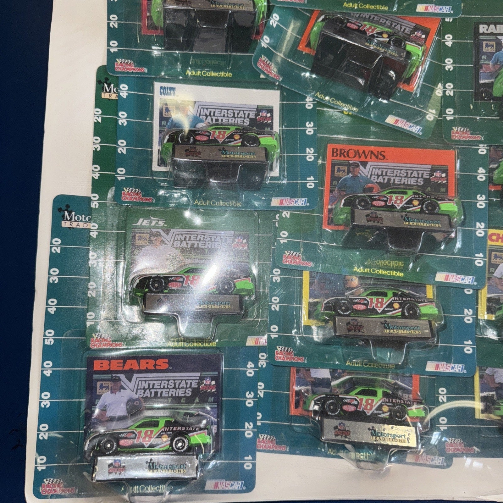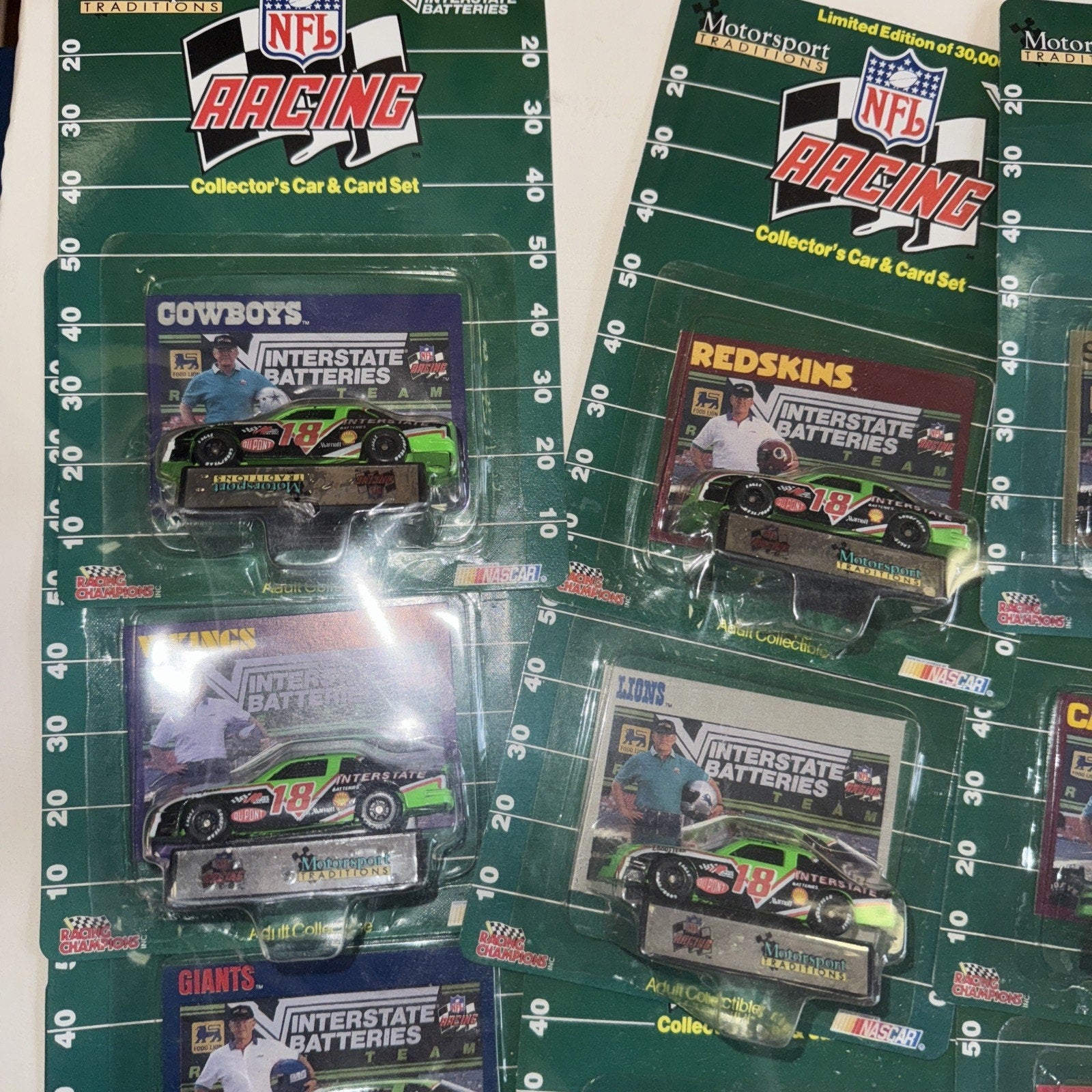This listing features the complete 1992 NFL/NASCAR Motorsport Traditions Interstate Batteries set by Racing Champions. All 28 cars are 1:64 scale, factory packaged, and professionally shrink-wrapped onto a custom display board—never opened, never removed.