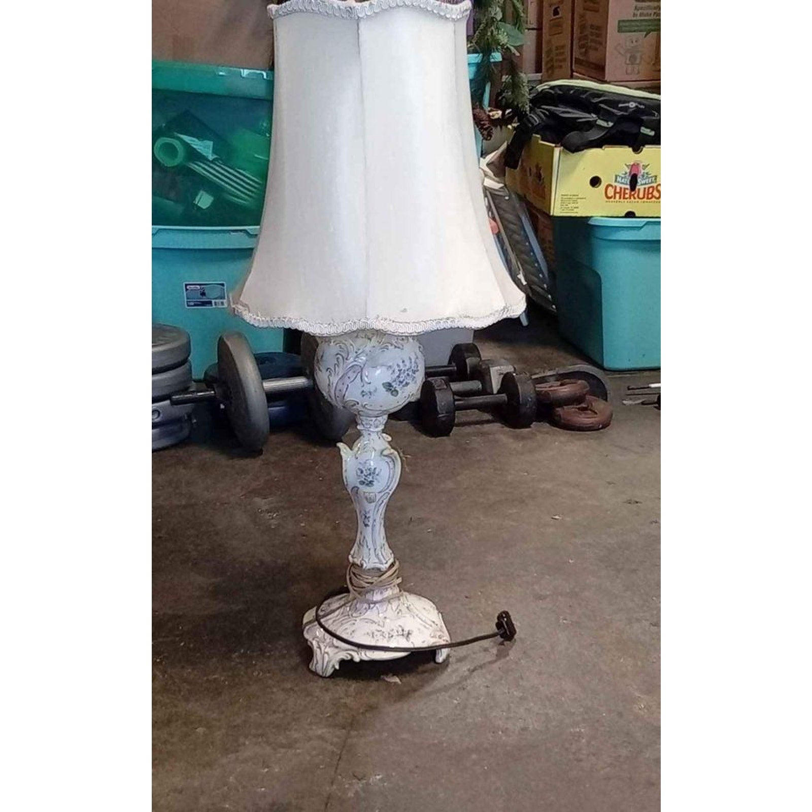 Standing at 32 inches tall with an 8-inch diameter at its base, the Antique Carl Jhieme Lamp hails from 1872 Dresden, Germany. Adorned with delicate pastel floral patterns, it exudes a timeless charm. The lamp shade complements its elegance with a cream hue, while please note, the light bulb is not included.