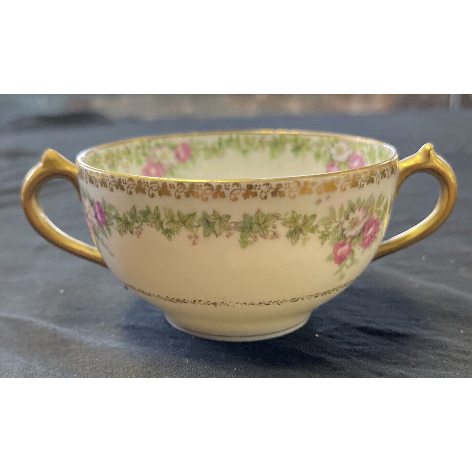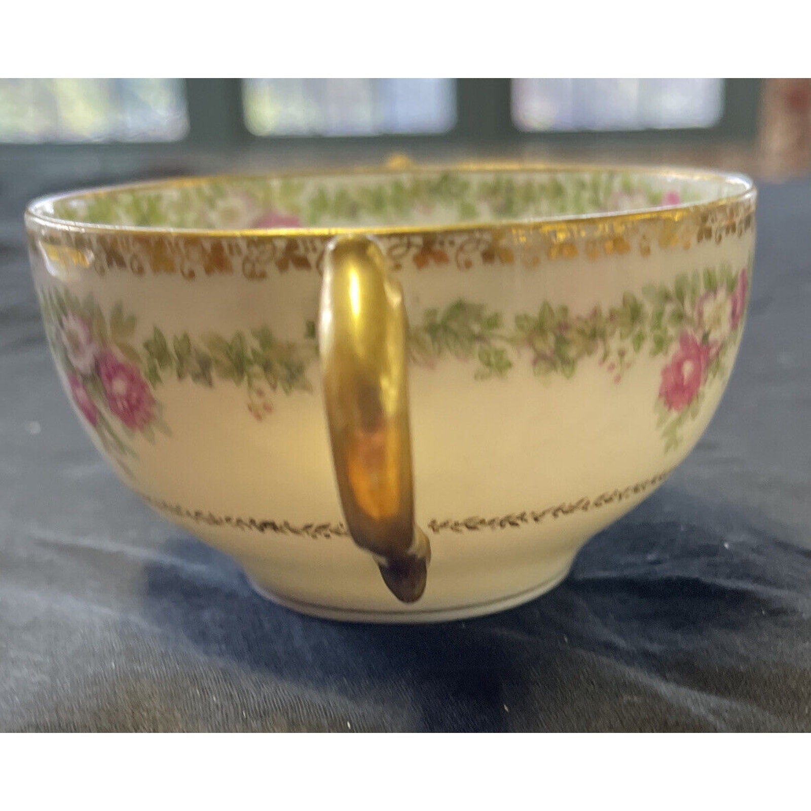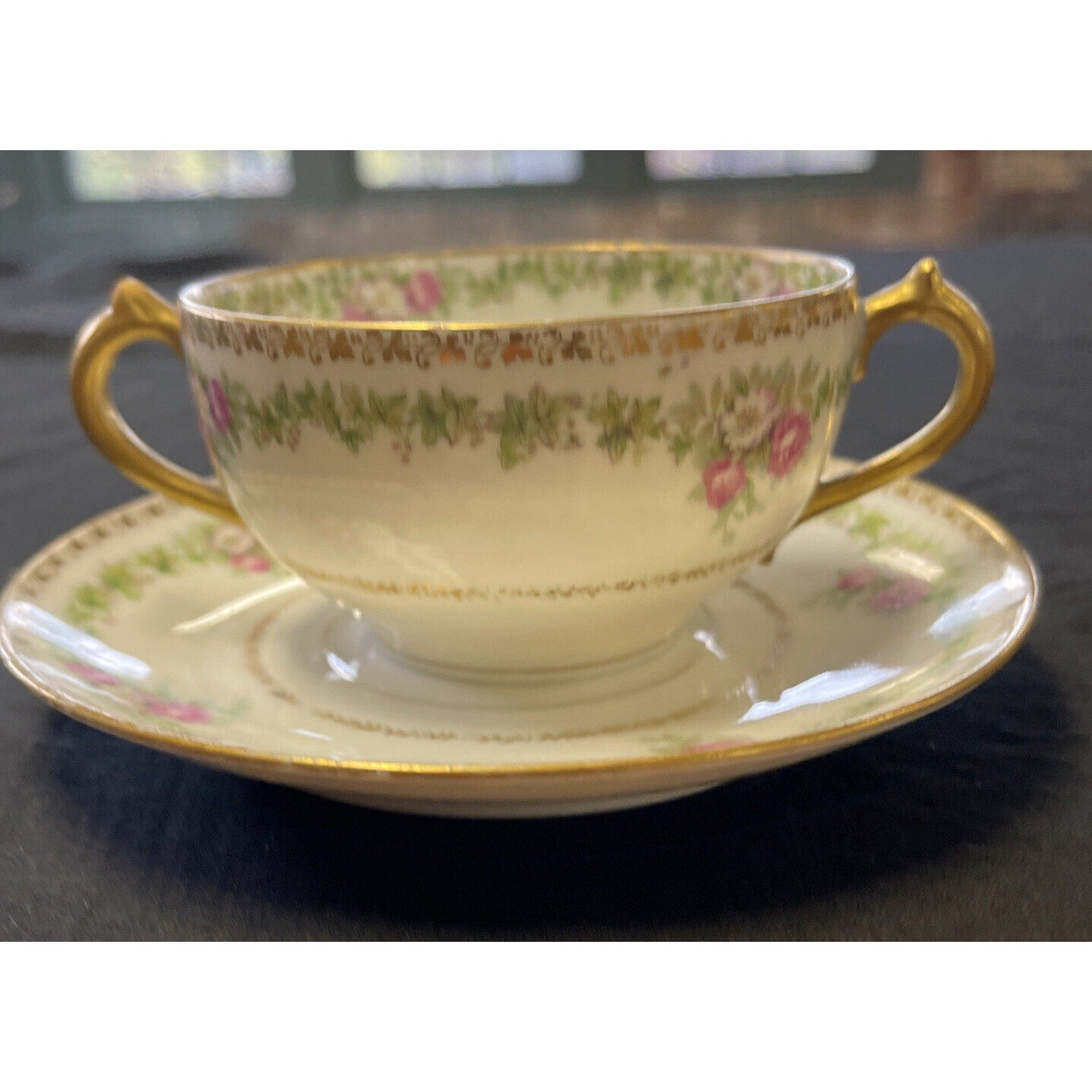 GDA Limoges Gilded w/ Ivy/Rose Pattern Cream Soup or Bullion Cup & Saucer