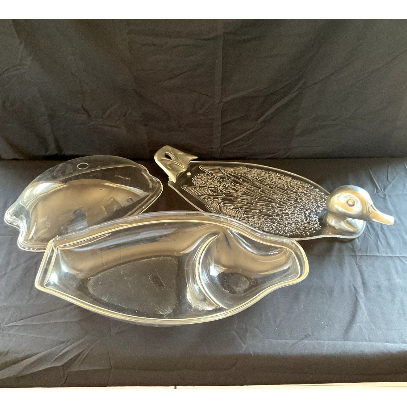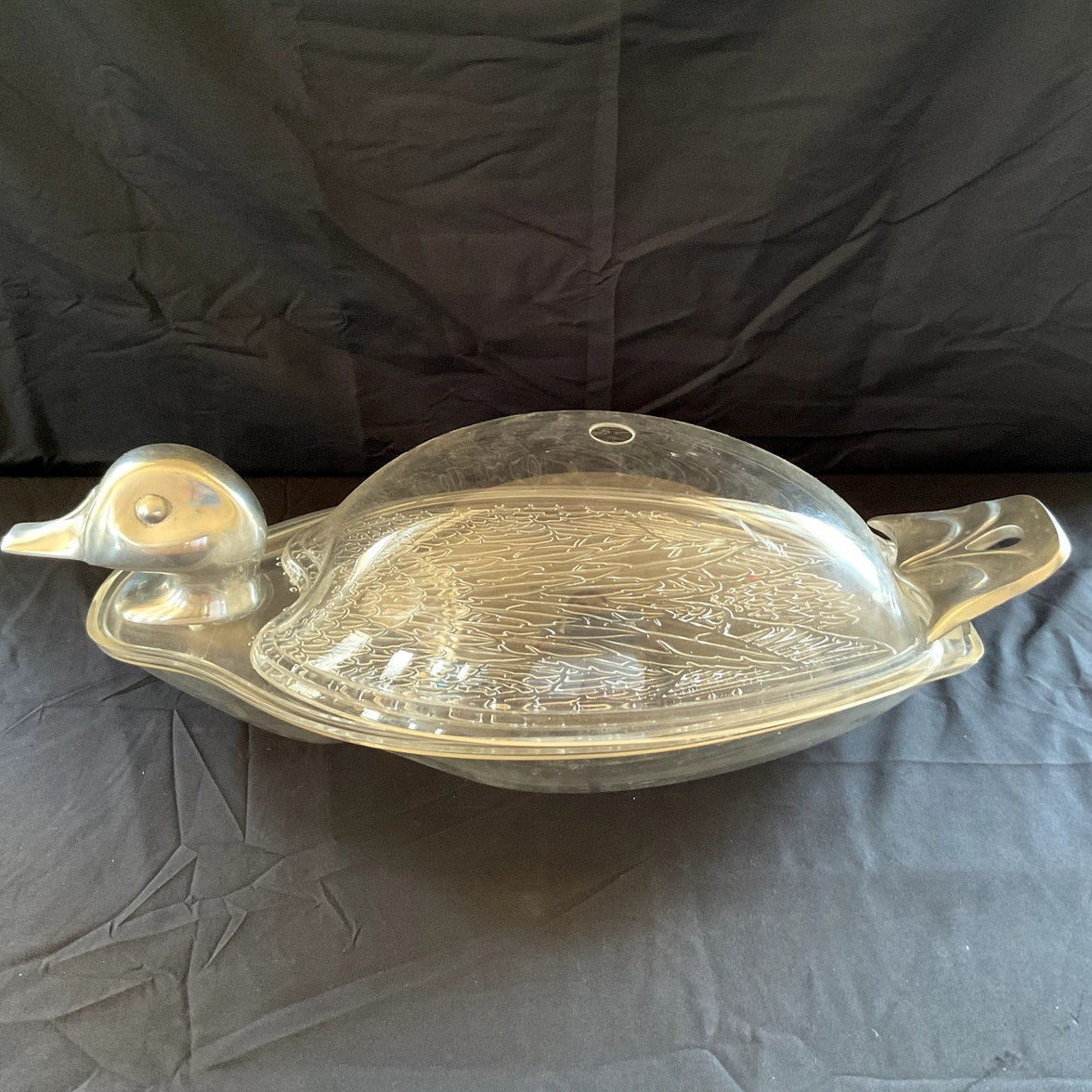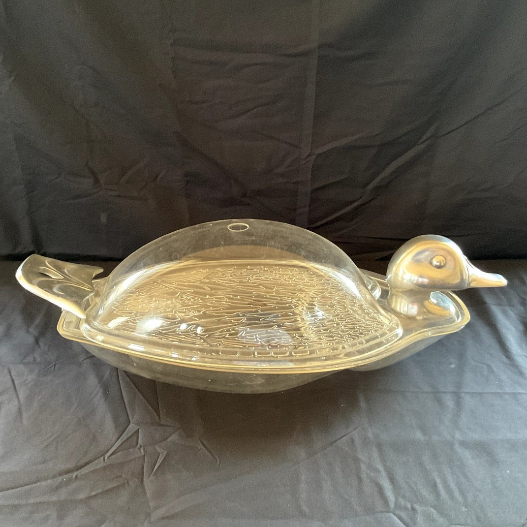 This lucite dish, shaped like a duck, measures 6 1/2 inches tall, 19 1/2 inches long, and 9 1/2 inches wide. It features two compartments for serving food, making it perfect for gatherings.
