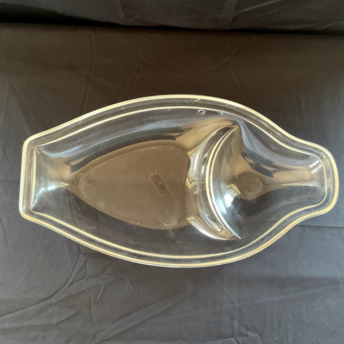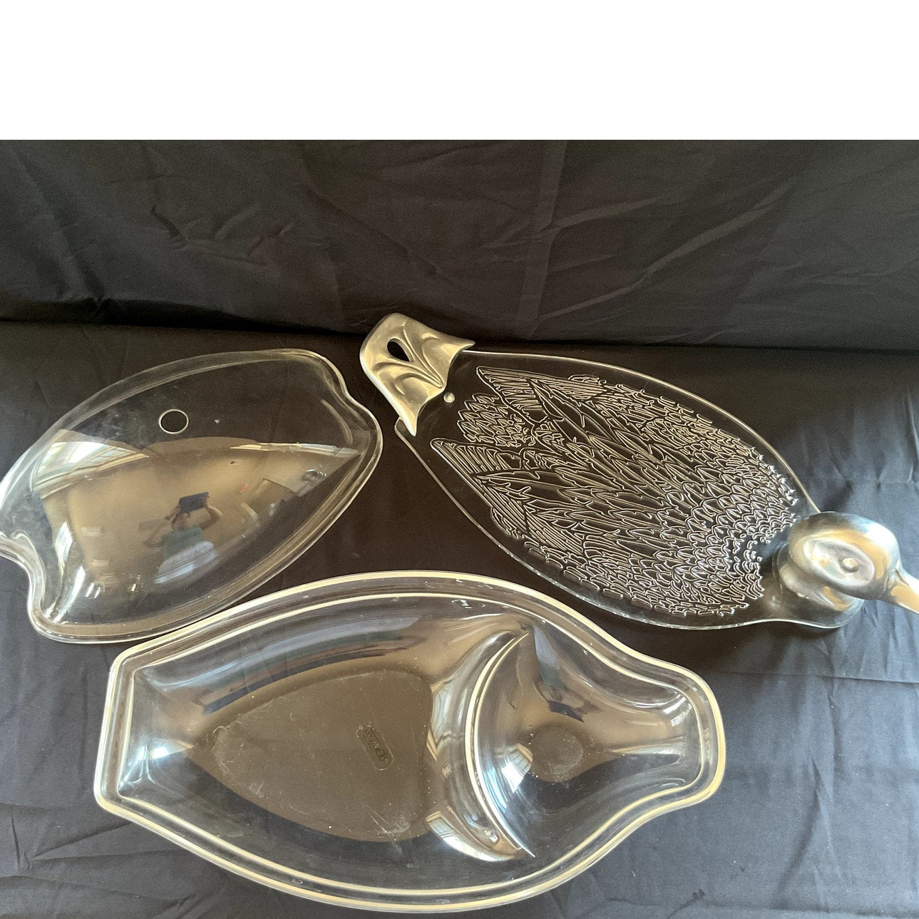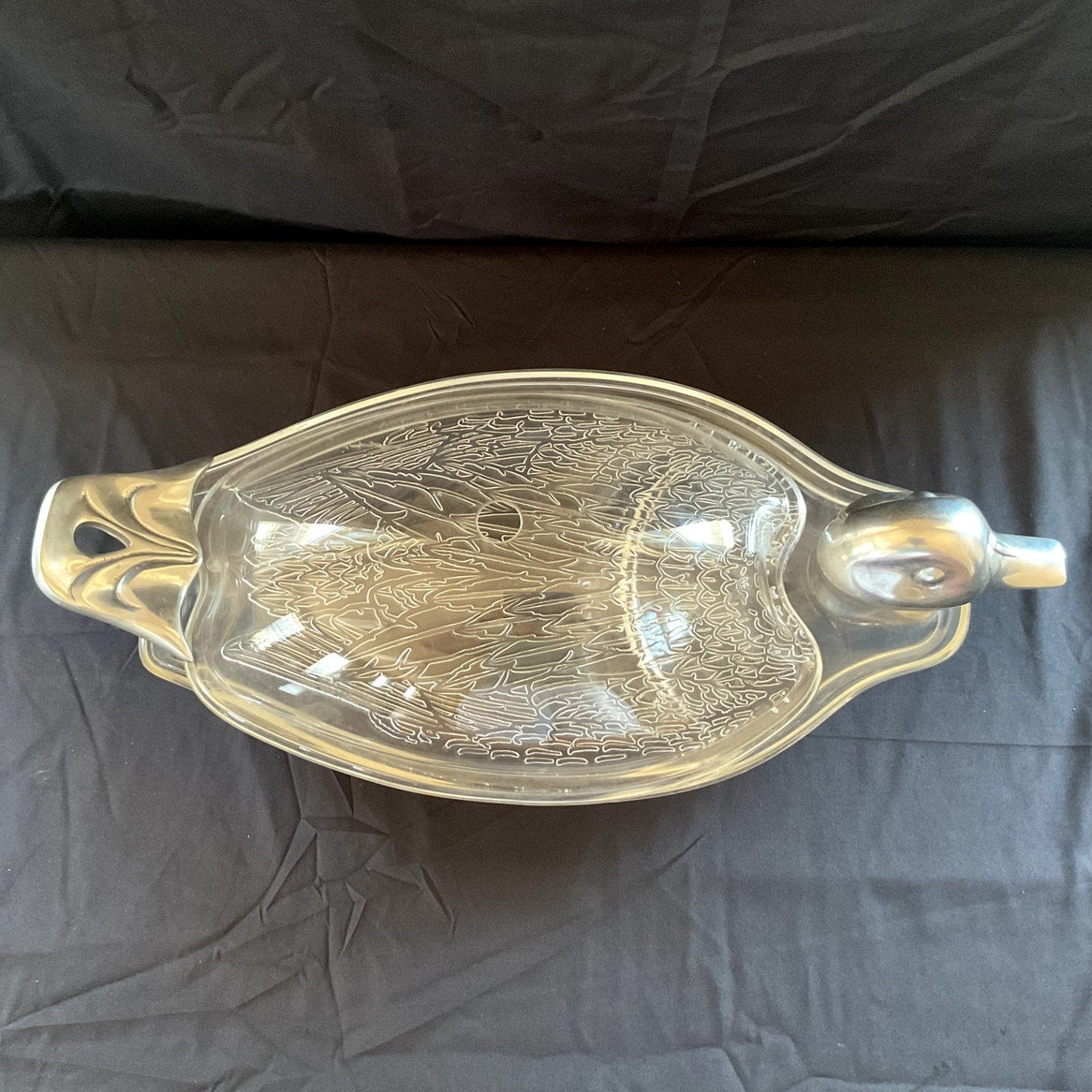 This lucite dish, shaped like a duck, measures 6 1/2 inches tall, 19 1/2 inches long, and 9 1/2 inches wide. It features two compartments for serving food, making it perfect for gatherings.