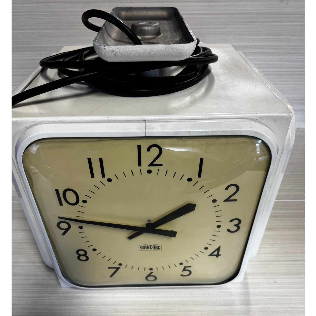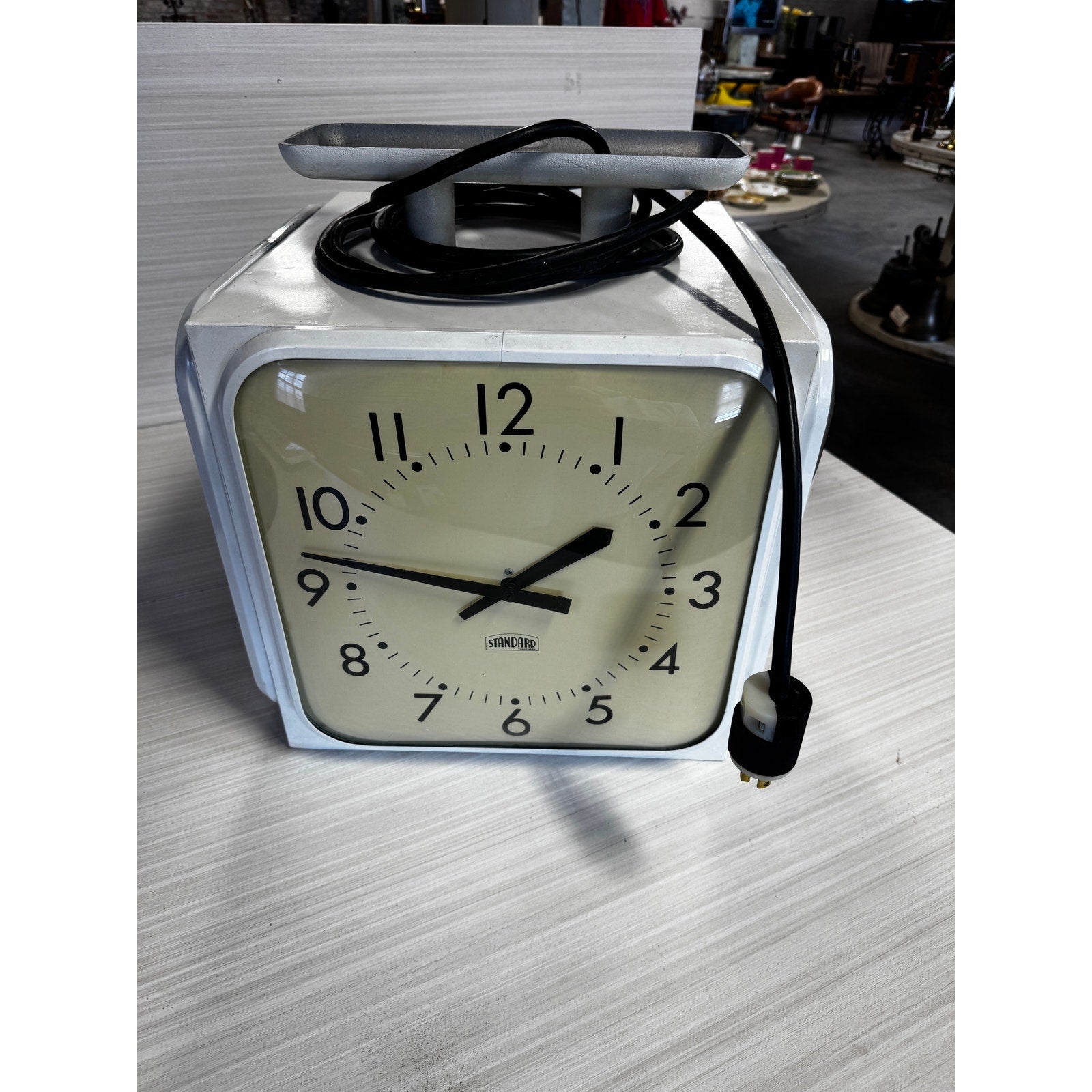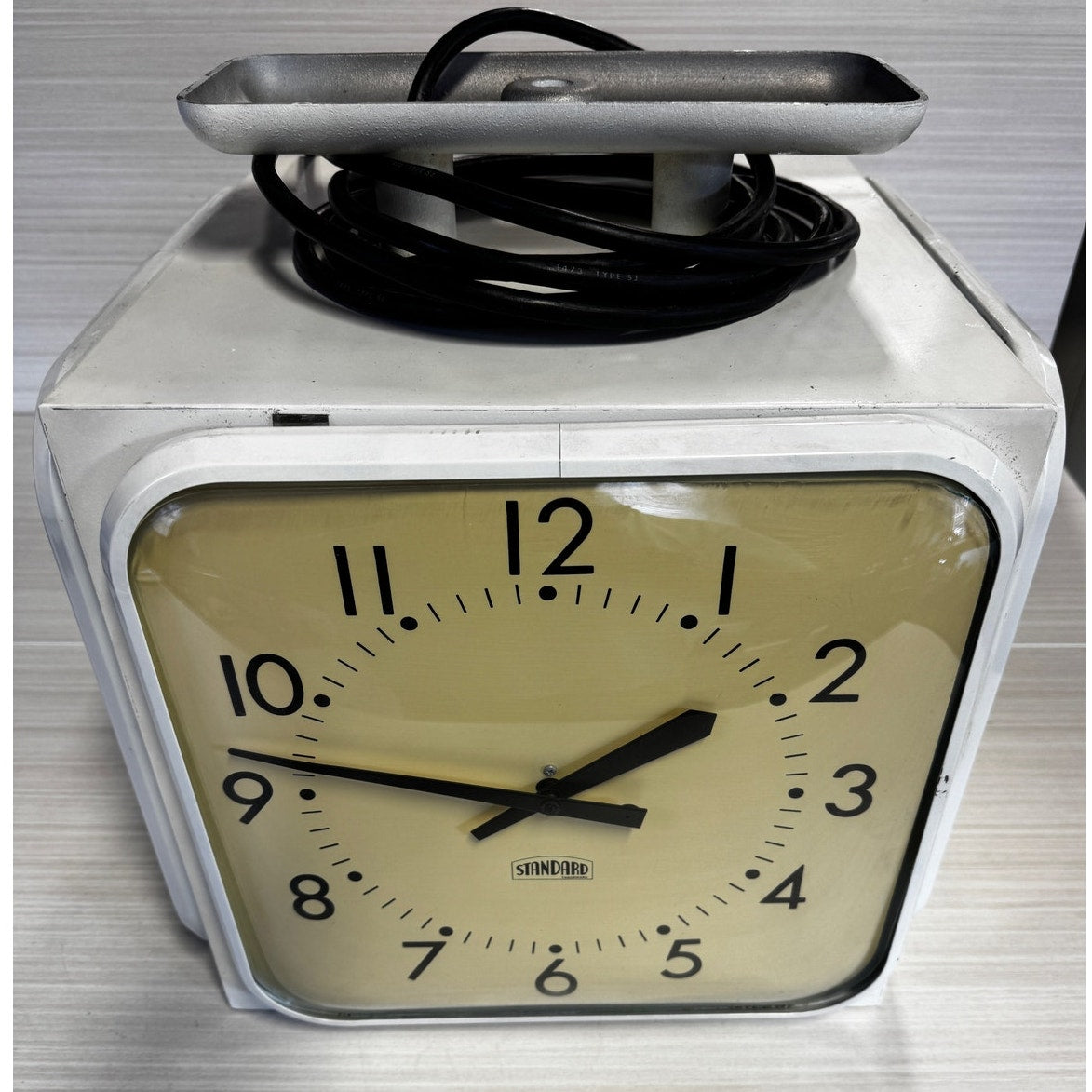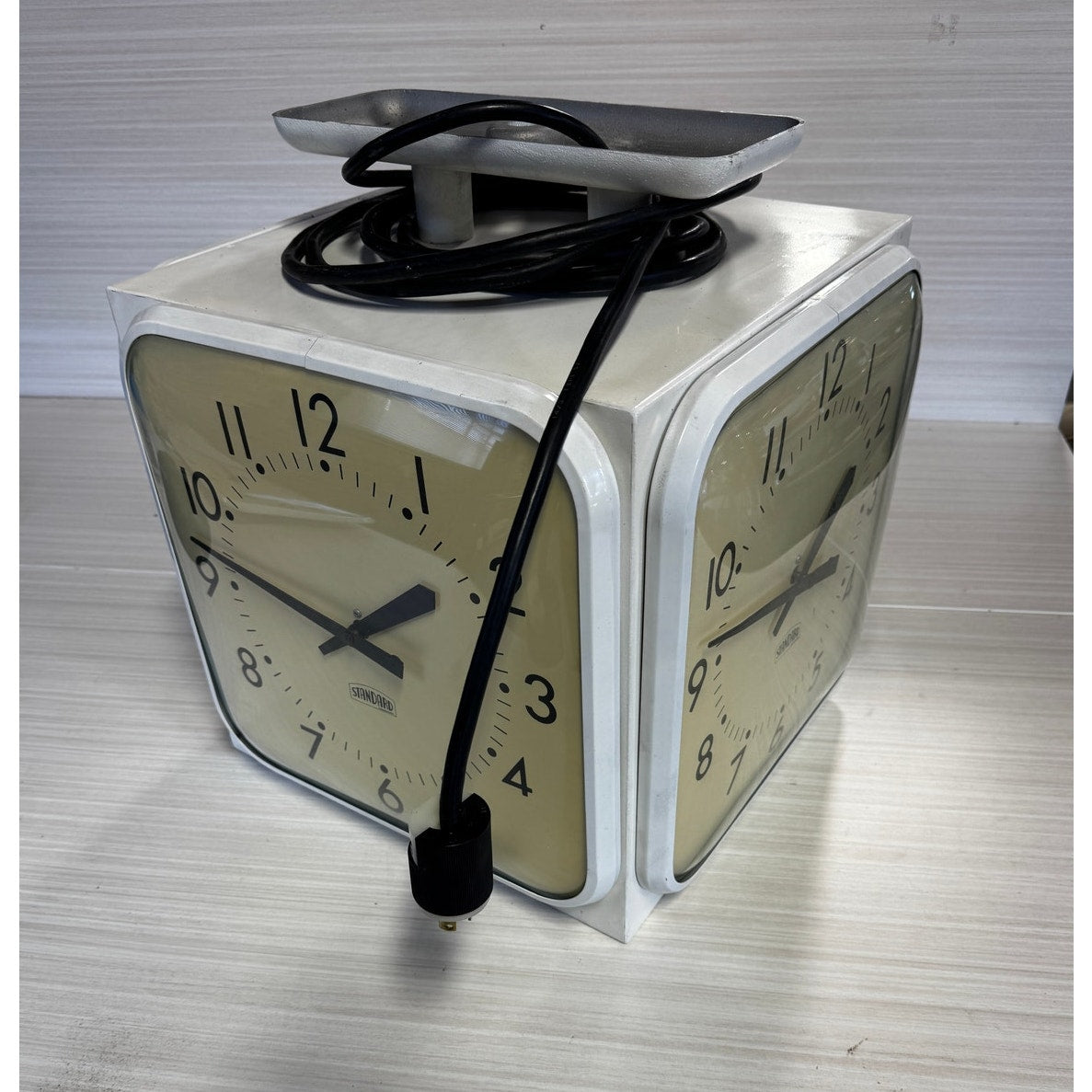 Tested and functional! This Vintage 4-Sided Cubed Clock features four 12" analog ceiling-mounted clocks on a 14" square enameled metal box, plus a fifth matching clock included separately. Initially designed for institutional or industrial use, this hardwired timepiece offers visibility from every angle—and a bonus clock for added flexibility or parts.
