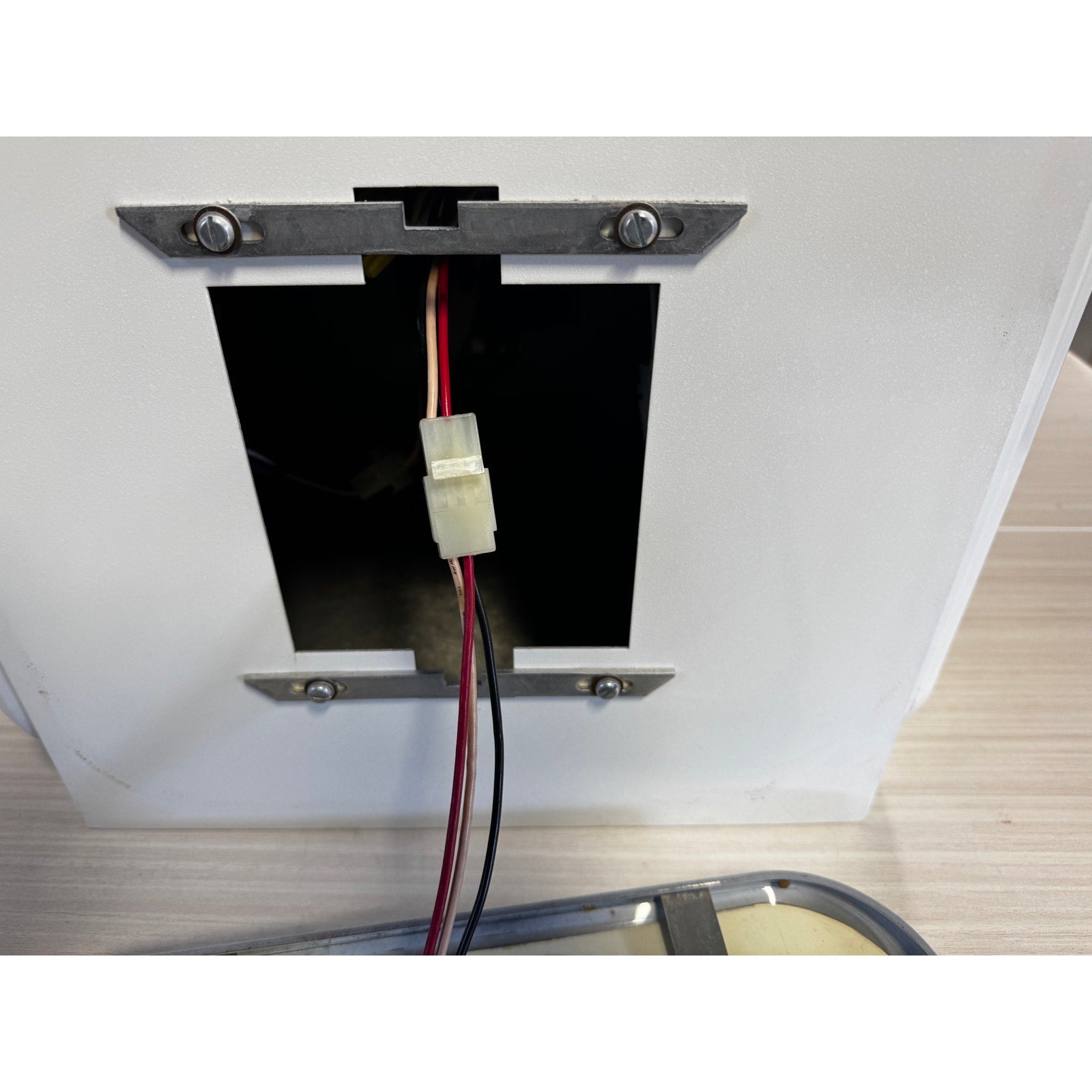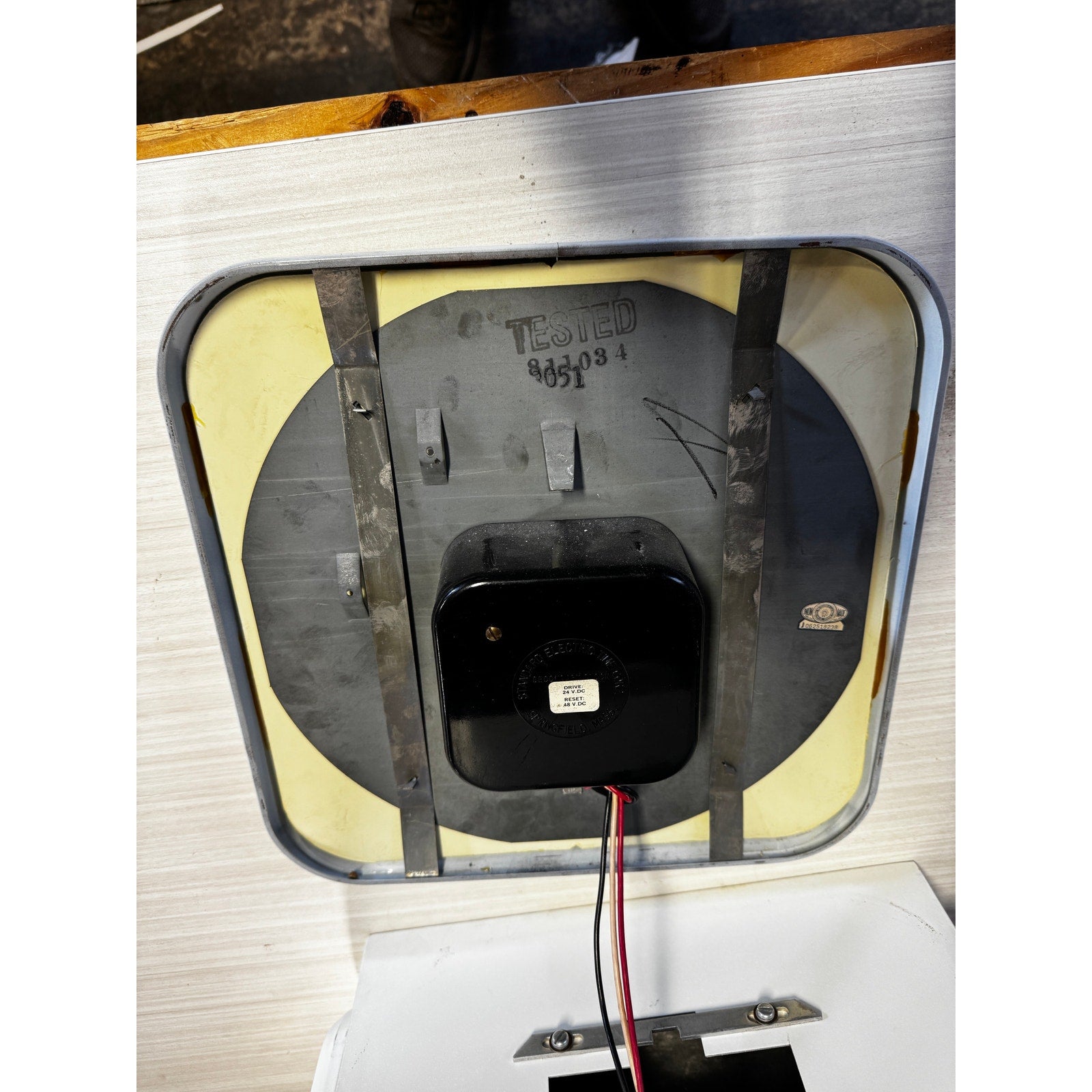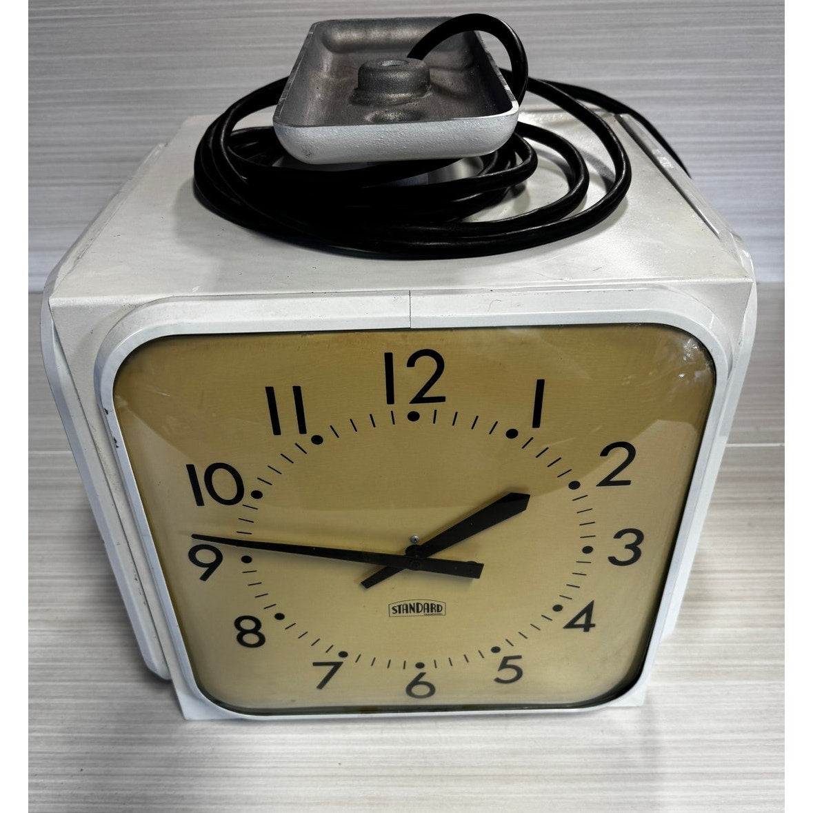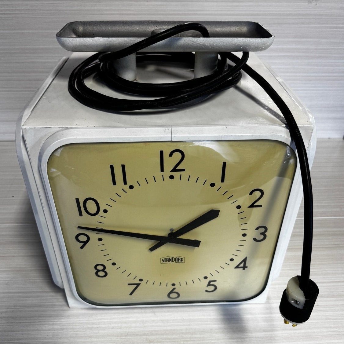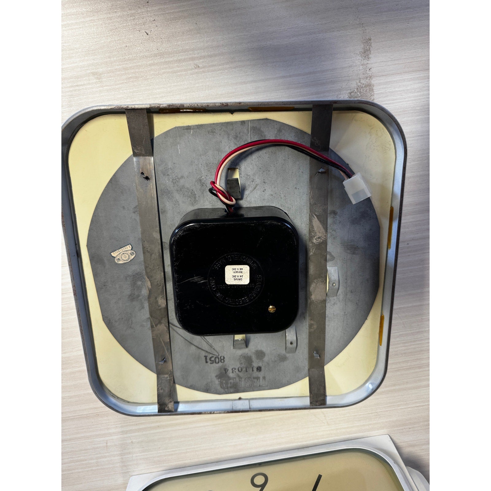 Tested and functional! This Vintage 4-Sided Cubed Clock features four 12" analog ceiling-mounted clocks on a 14" square enameled metal box, plus a fifth matching clock included separately. Initially designed for institutional or industrial use, this hardwired timepiece offers visibility from every angle—and a bonus clock for added flexibility or parts.