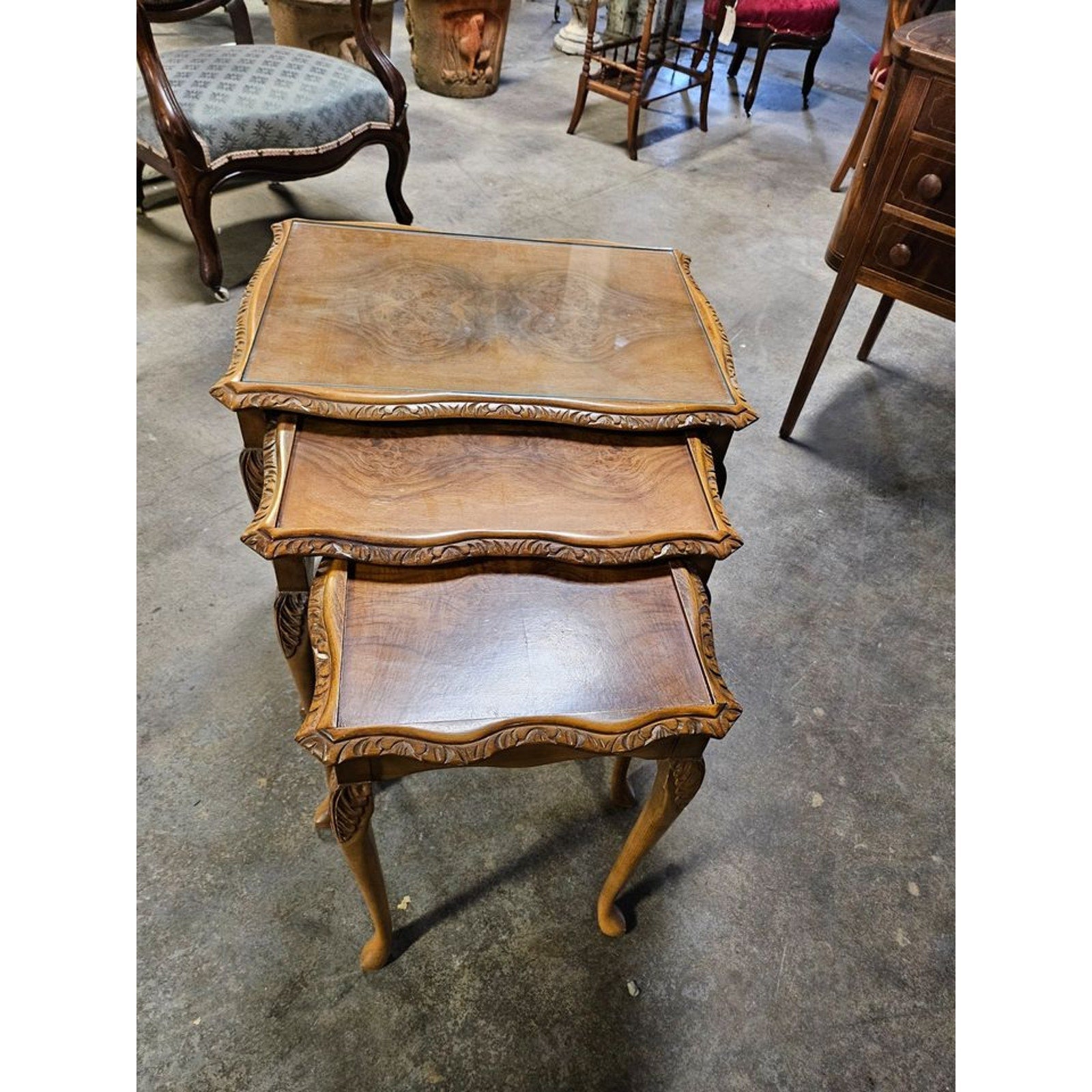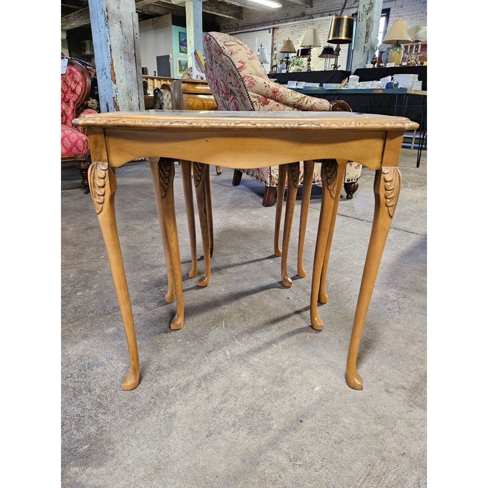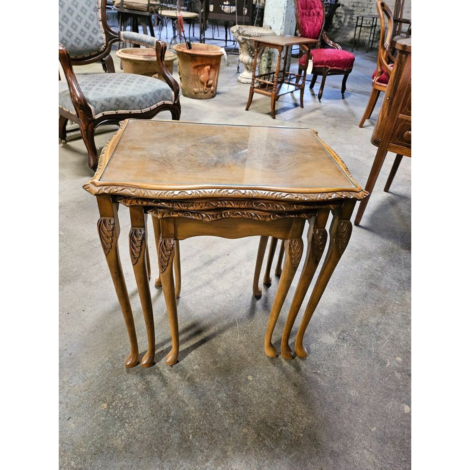 Set of three vintage nesting tables made of mahogany. Nice quality. Slender cabriole legs in the Queen Anne style. Hand carved upper legs and table rims. These lovely tables easily open to form three separate tables when required. Top largest table has glass top.
