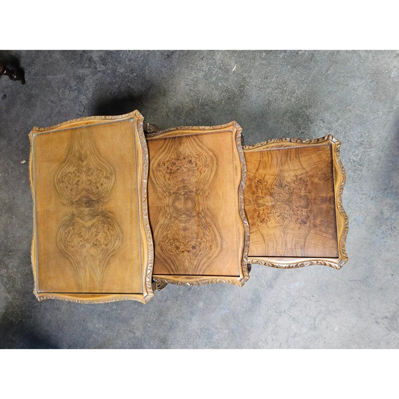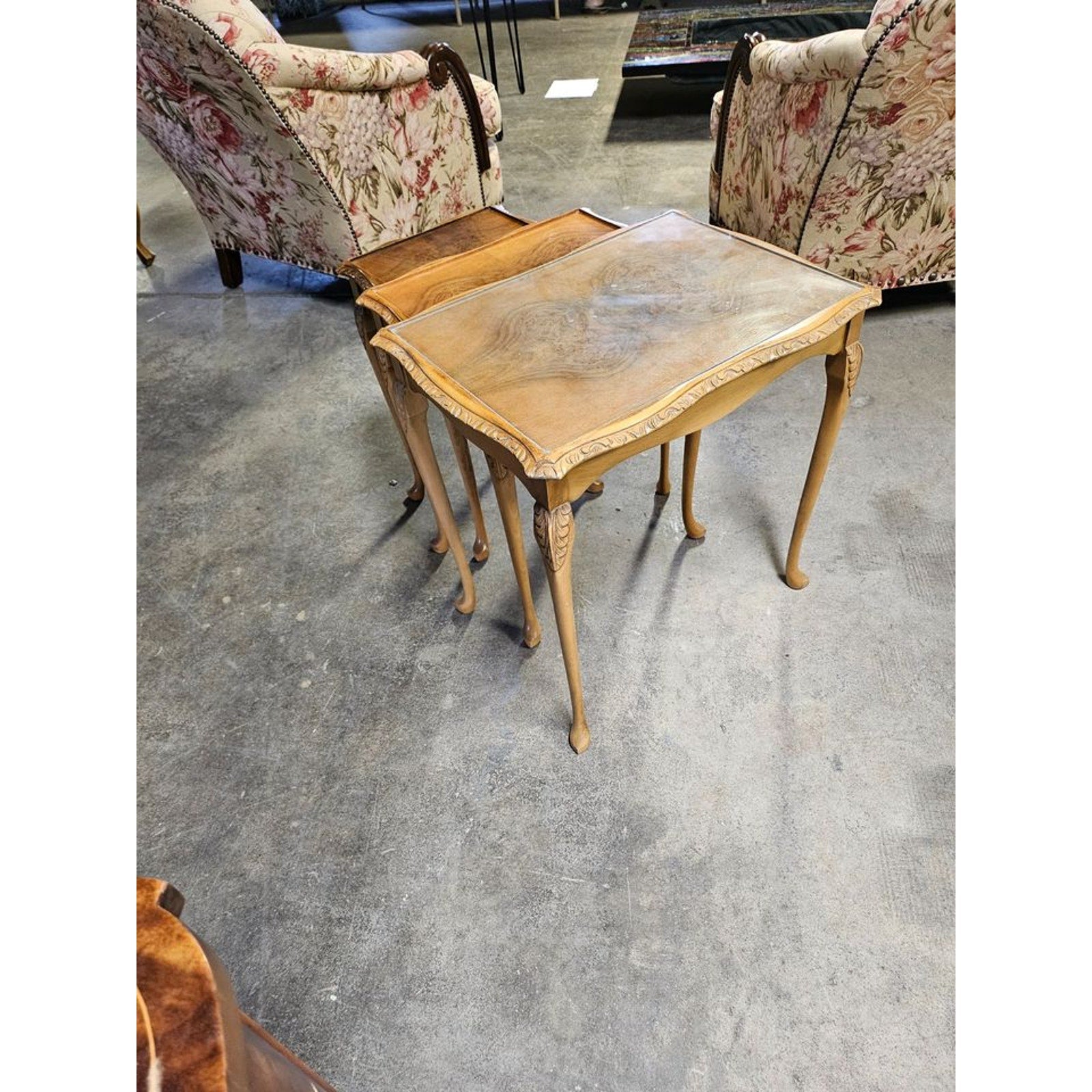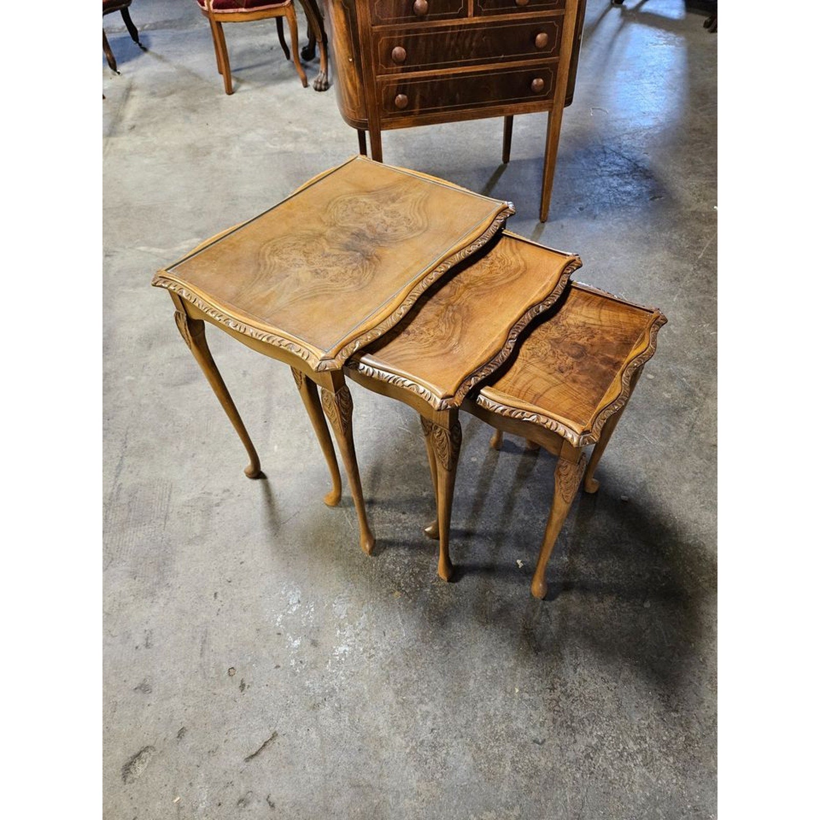 Set of three vintage nesting tables made of mahogany. Nice quality. Slender cabriole legs in the Queen Anne style. Hand carved upper legs and table rims. These lovely tables easily open to form three separate tables when required. Top largest table has glass top.