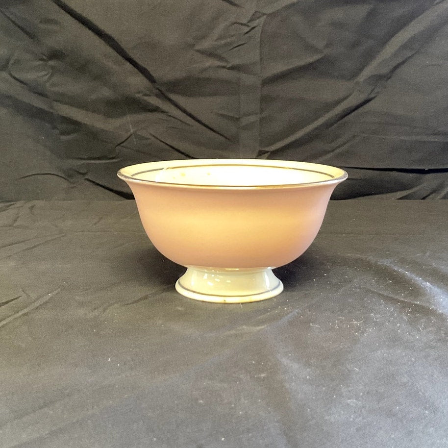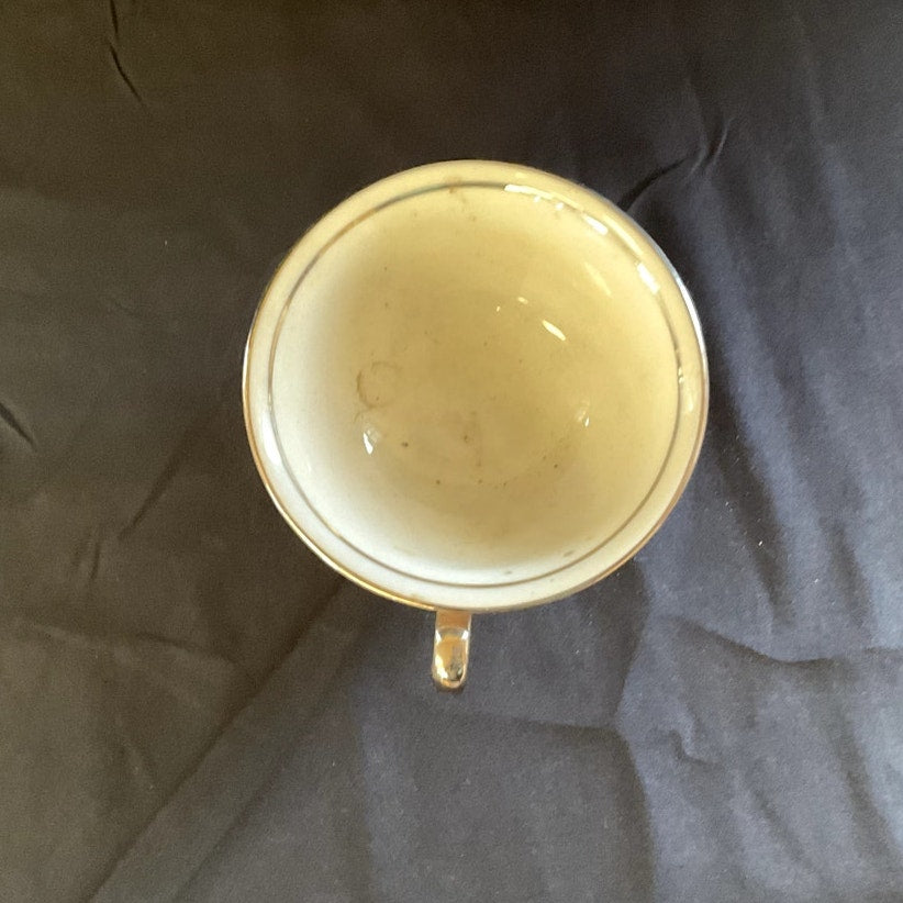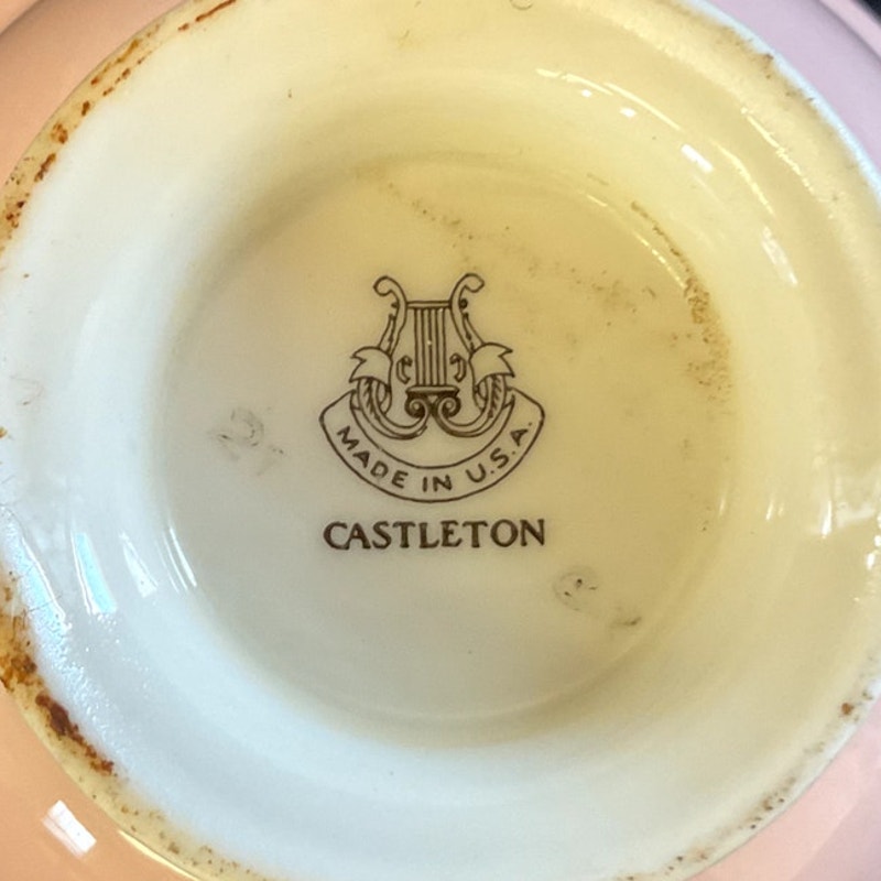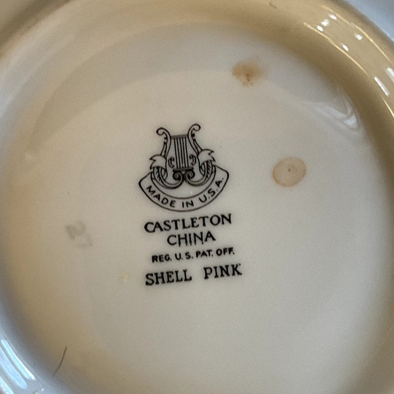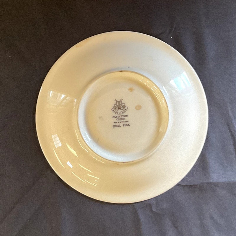 This charming tea cup and saucer set, crafted by Castleton in the USA, features a delicate "Shell Pink" hue with refined dimensions. The cup stands 2 1/8 inches tall, with a diameter of 4 inches and an overall length of 4 7/8 inches, including the handles. The base measures 2 inches in diameter. The saucer has a diameter of 5 7/8 inches. Both pieces are elegantly adorned with silver accents along the edges, adding a touch of sophistication to their simple and appealing design. This set combines subtle elegance with classic charm, making it a delightful addition to any tea collection.