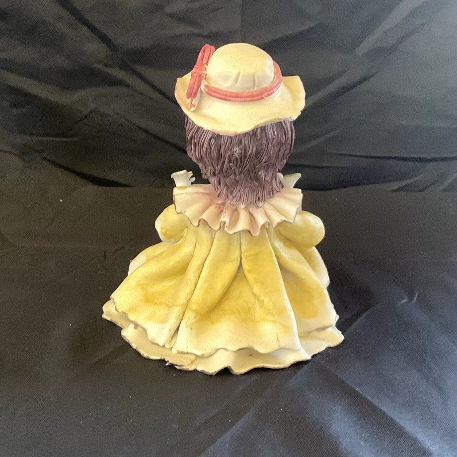 Dimensions: 5 inches tall, 4 1/4 inches long, and 4 1/4 inches wide. This charming figurine, named "Lilly," depicts a figure dressed in a delicate, flowy white dress and holding a bouquet of flowers. The figurine features brown spaghetti-like hair, adding to its detailed and graceful appearance. Crafted by Sorelle.