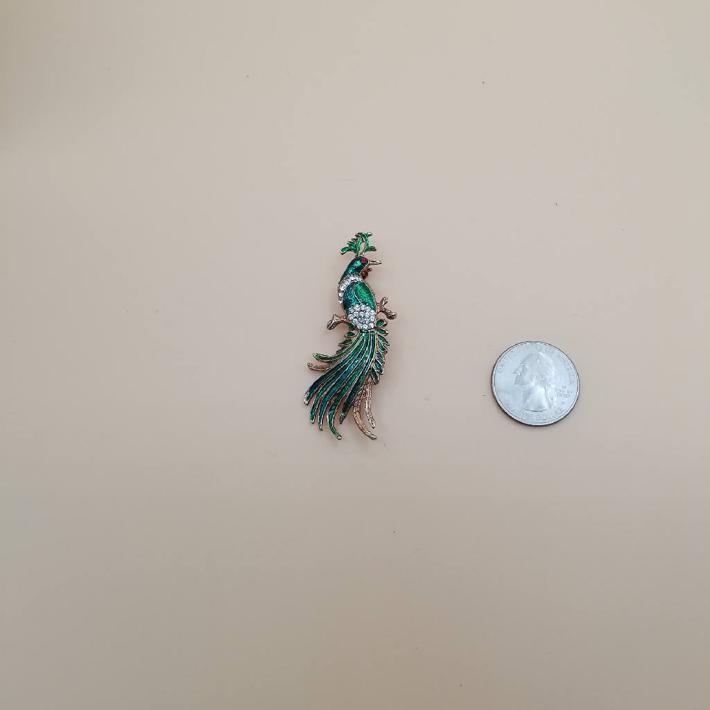 Green Enamel Peacock Brooch Pin with Crystal Accents