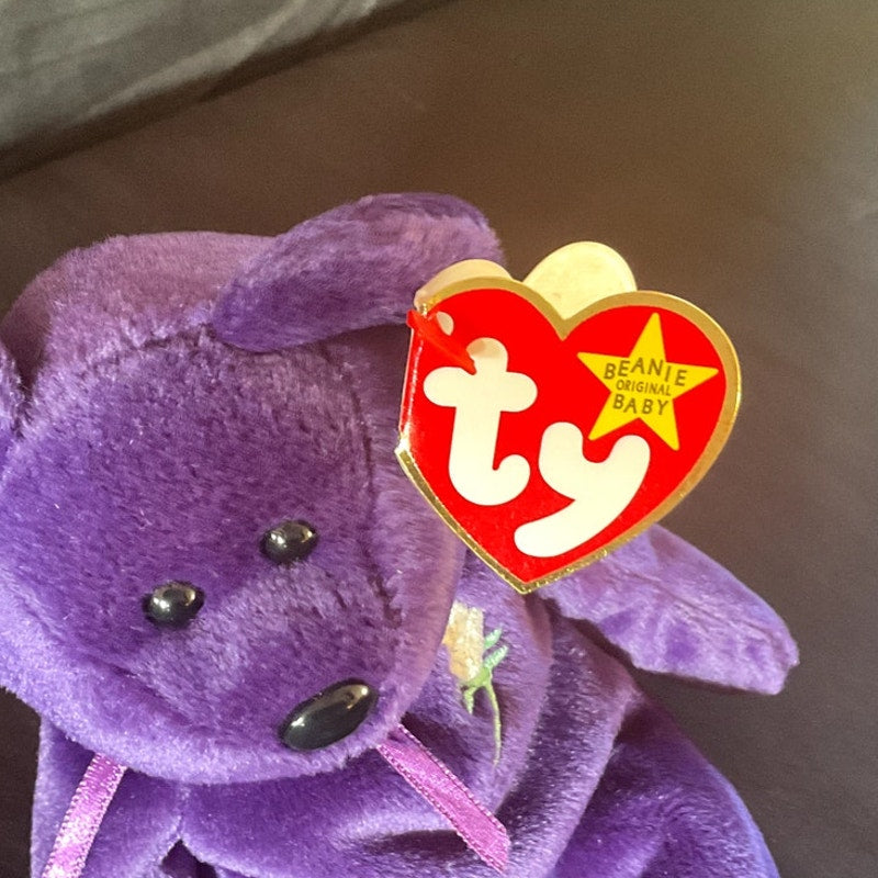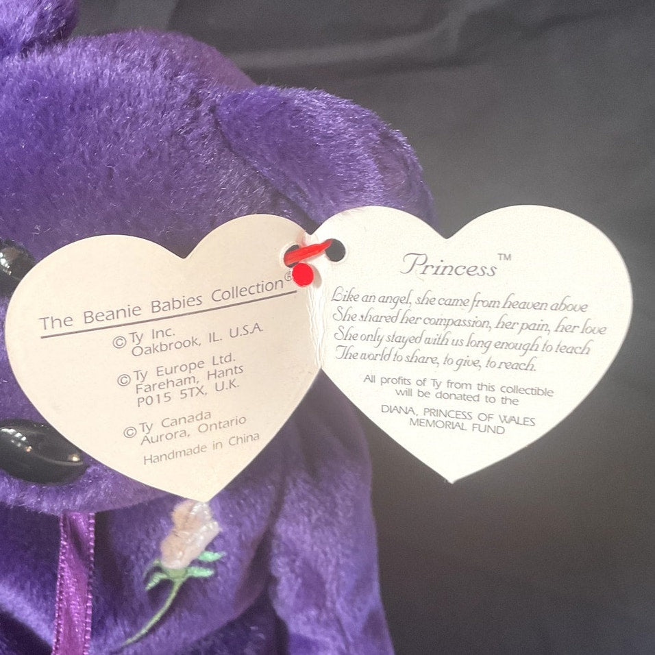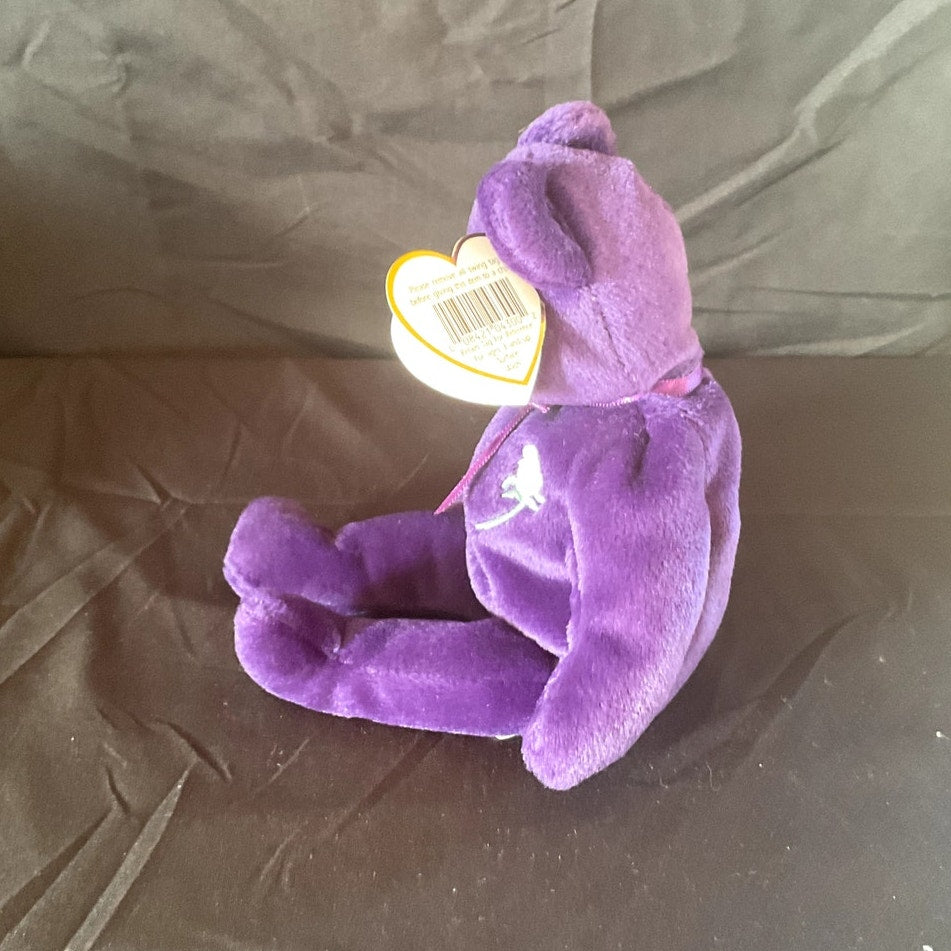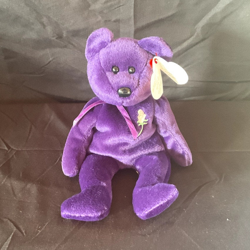 This distinguished TY Beanie Baby, named "Princess," was specially created to honor Princess Diana, the beloved Princess of Wales. The plush toy is designed in the likeness of a bear and features a luxurious deep purple color, complemented by an embroidered white rose design on its heart. The original TY tag remains attached, affirming its authenticity. In 100% mint condition and made in China, this Beanie Baby is an ideal addition for collectors or a thoughtful gift for a cherished loved one.