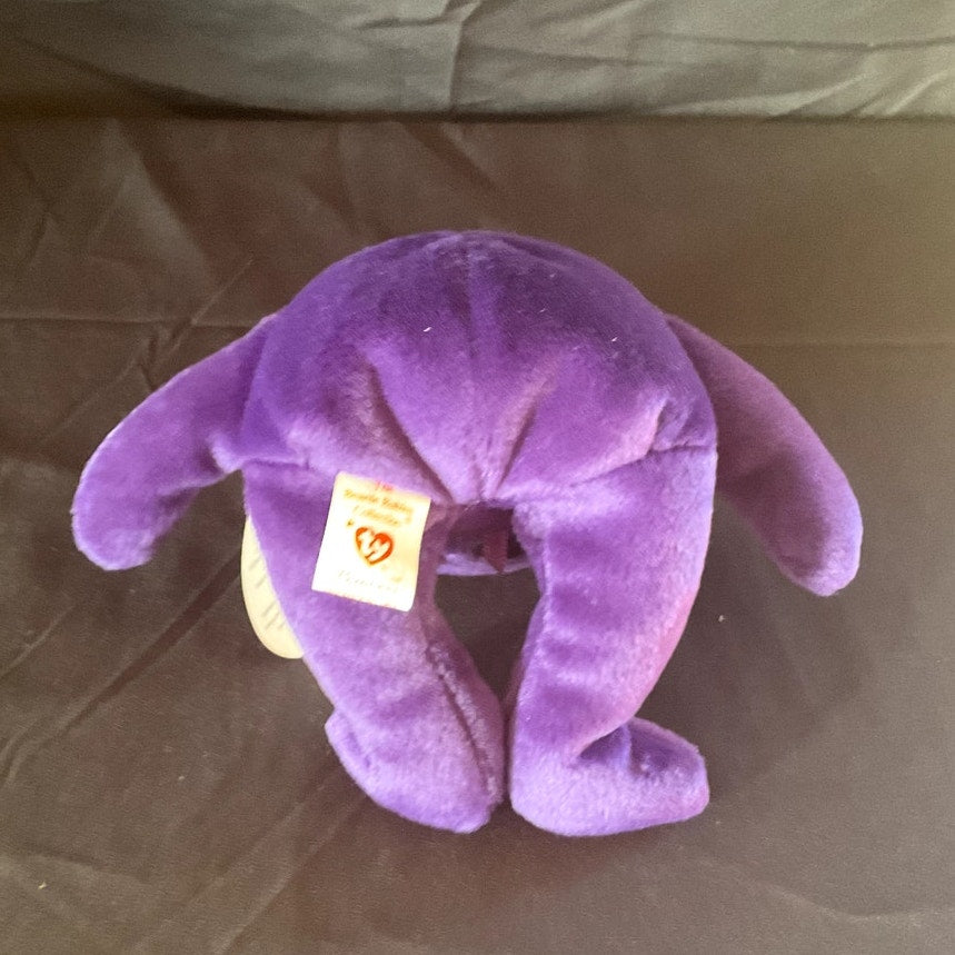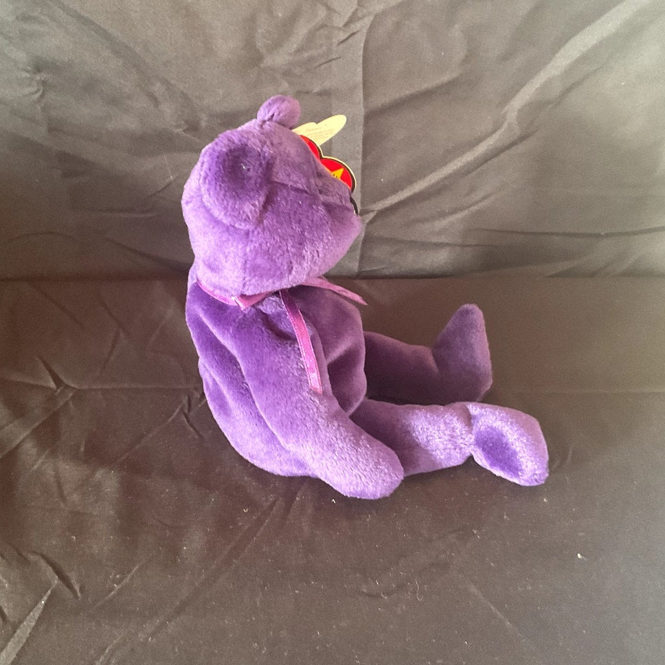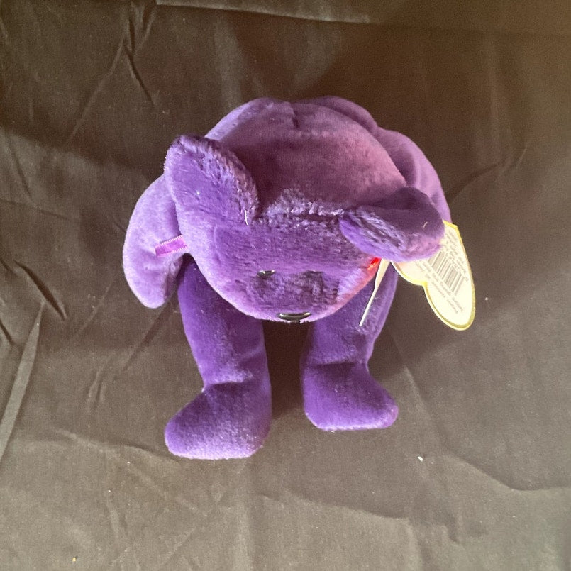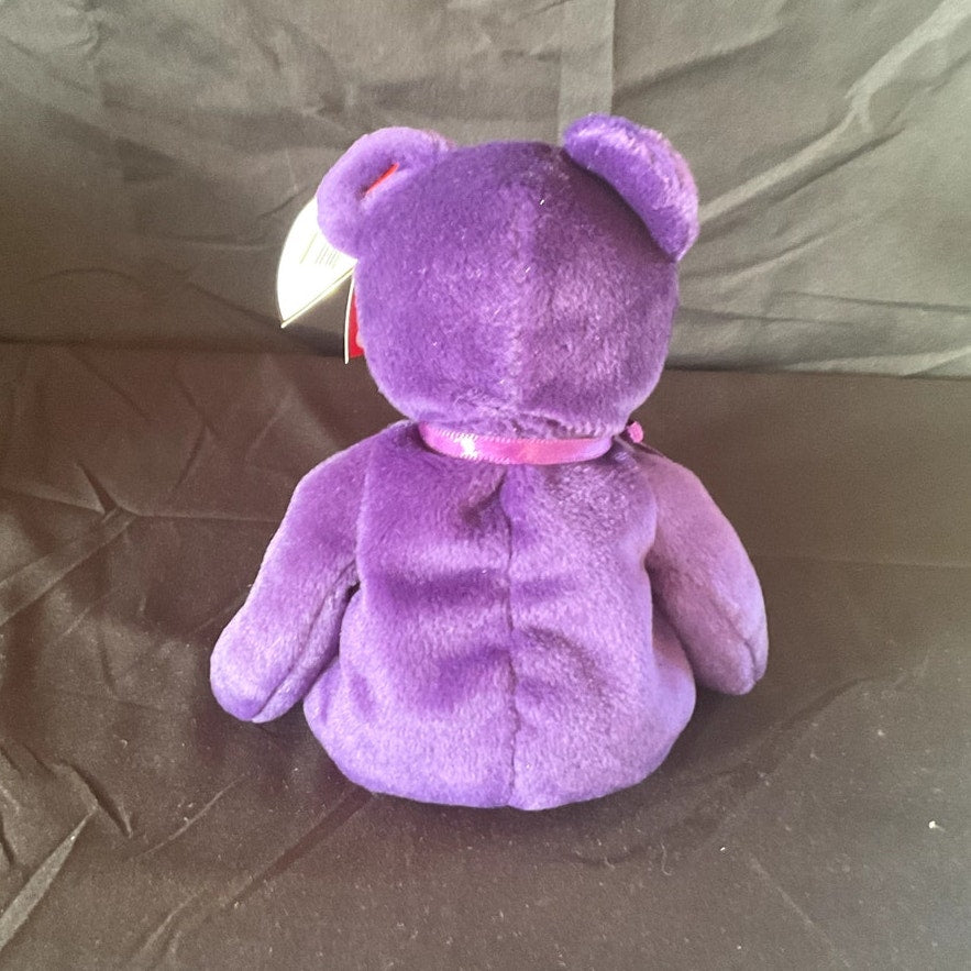 This distinguished TY Beanie Baby, named "Princess," was specially created to honor Princess Diana, the beloved Princess of Wales. The plush toy is designed in the likeness of a bear and features a luxurious deep purple color, complemented by an embroidered white rose design on its heart. The original TY tag remains attached, affirming its authenticity. In 100% mint condition and made in China, this Beanie Baby is an ideal addition for collectors or a thoughtful gift for a cherished loved one.