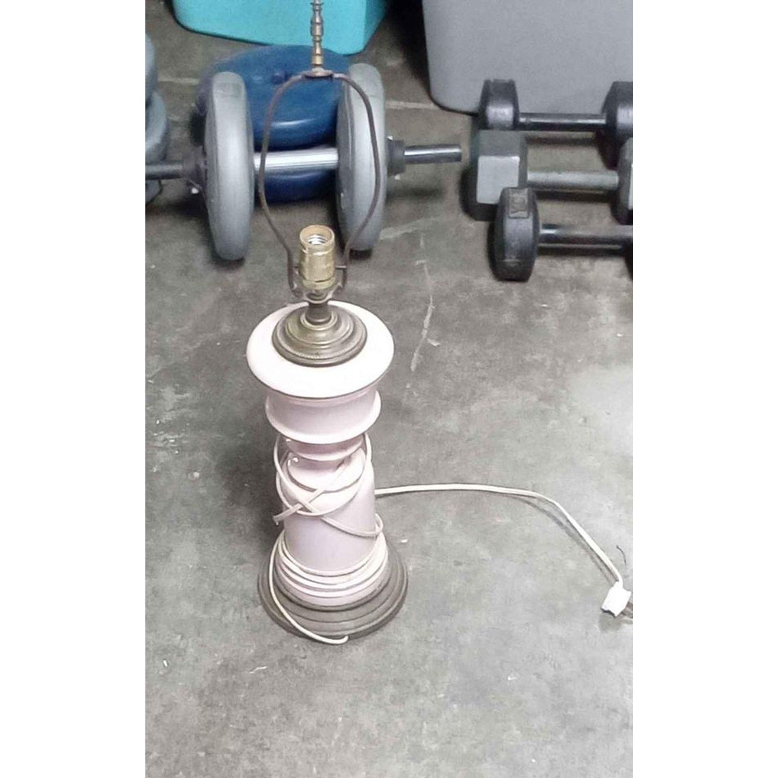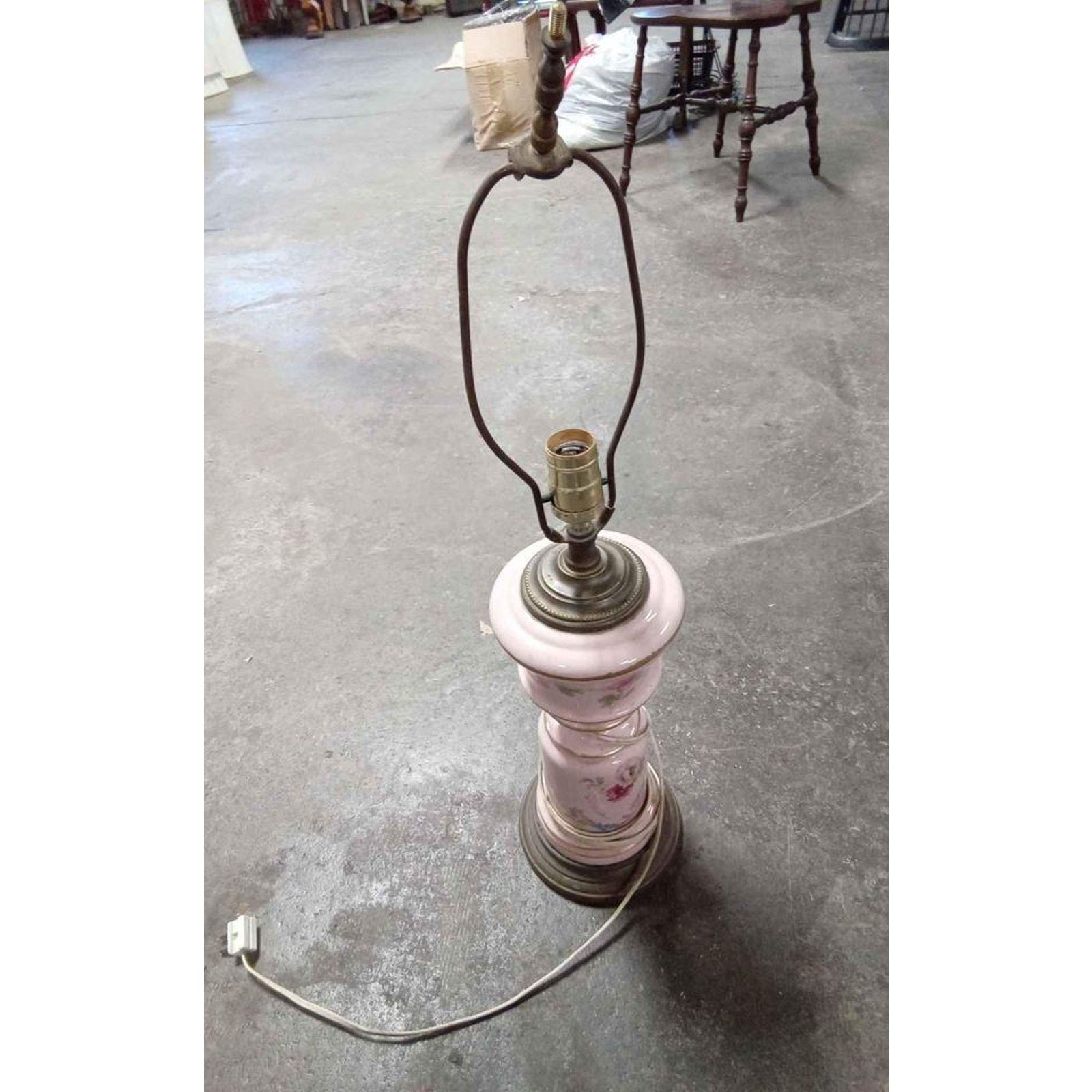 This elegant lamp features a 94-inch wall cord (close to 8 feet) and stands 25 inches tall with a bottom diameter of 6 1/2 inches. It showcases beautiful pink floral patterns complemented by delicate gold trimming. Please note, the lamp shade and light bulb are not included.
