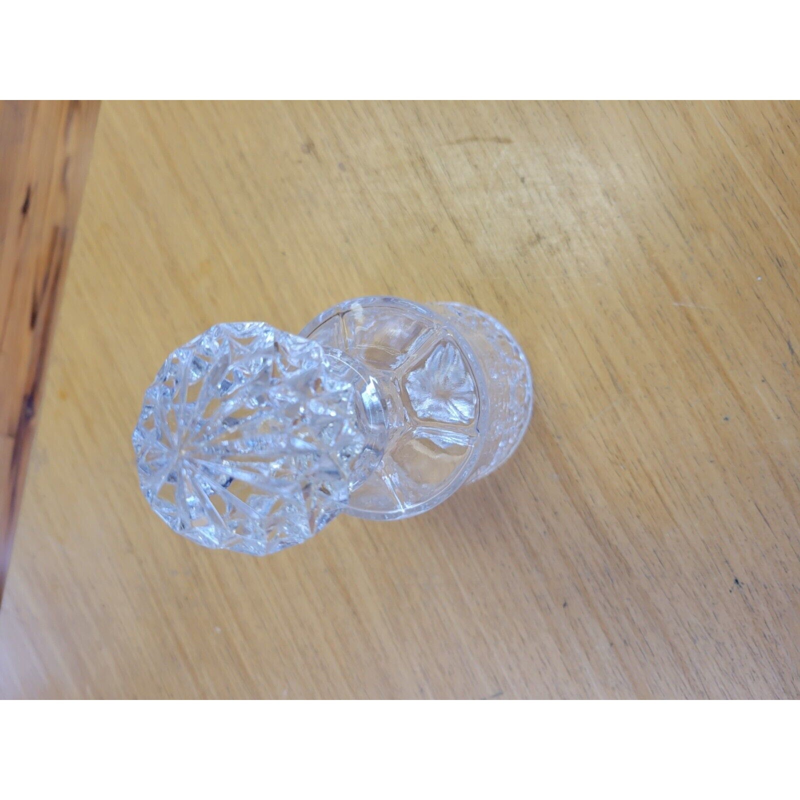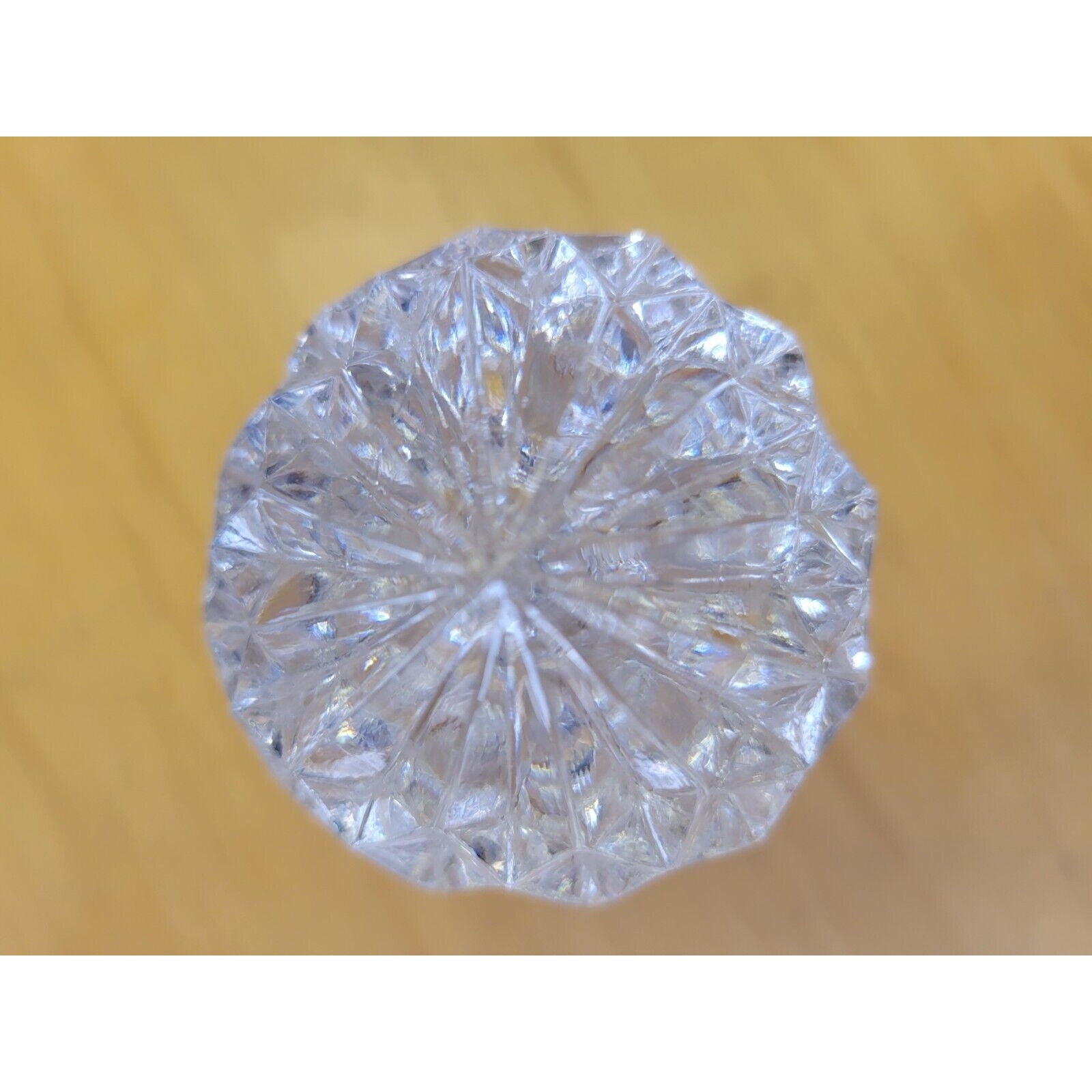 Including the stopper, the decanter stands 11 inches tall and measures 8 1/4 inches tall without the stopper. The base has a diameter of 4 3/8 inches. The stopper itself is adorned with a diamond-style pattern on the sides and a starburst pattern on the top, harmonizing with the decanter's overall design.