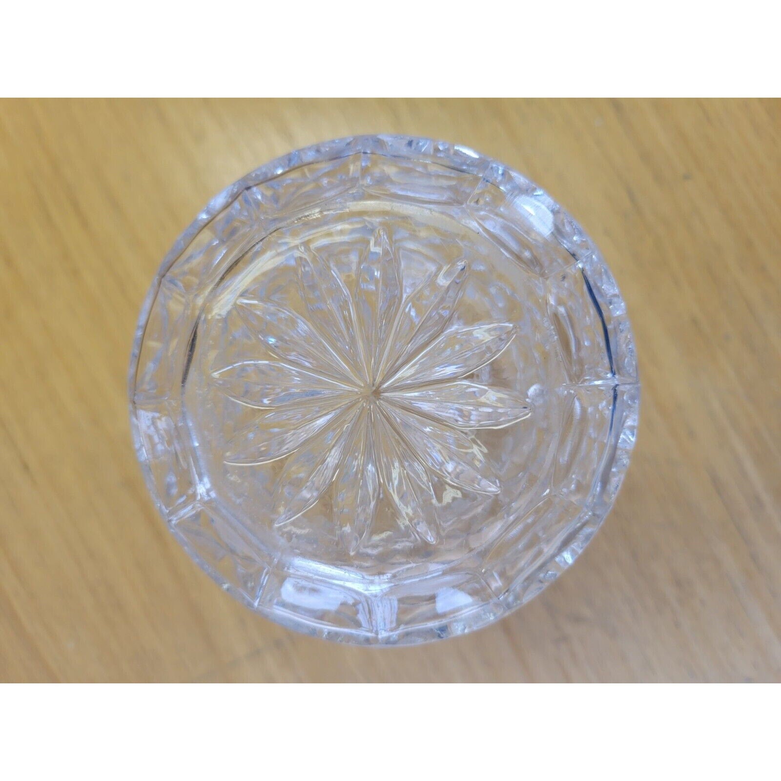 The vintage cut glass crystal decanter is a sophisticated piece suitable for storing wine, whiskey, or liquor. Its design features a diamond-style pattern around the sides with an oval cut above it, accentuated by a starburst design at the bottom. The shoulder and neck of the decanter are elegantly fluted, adding to its decorative appeal.