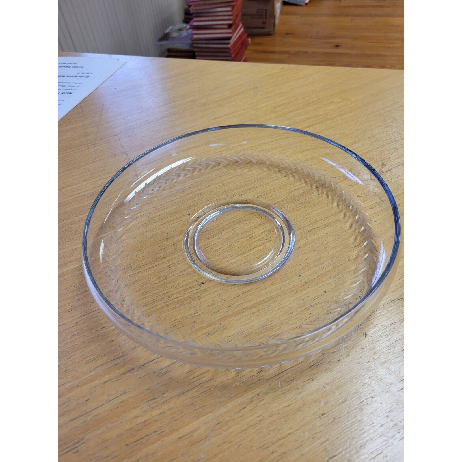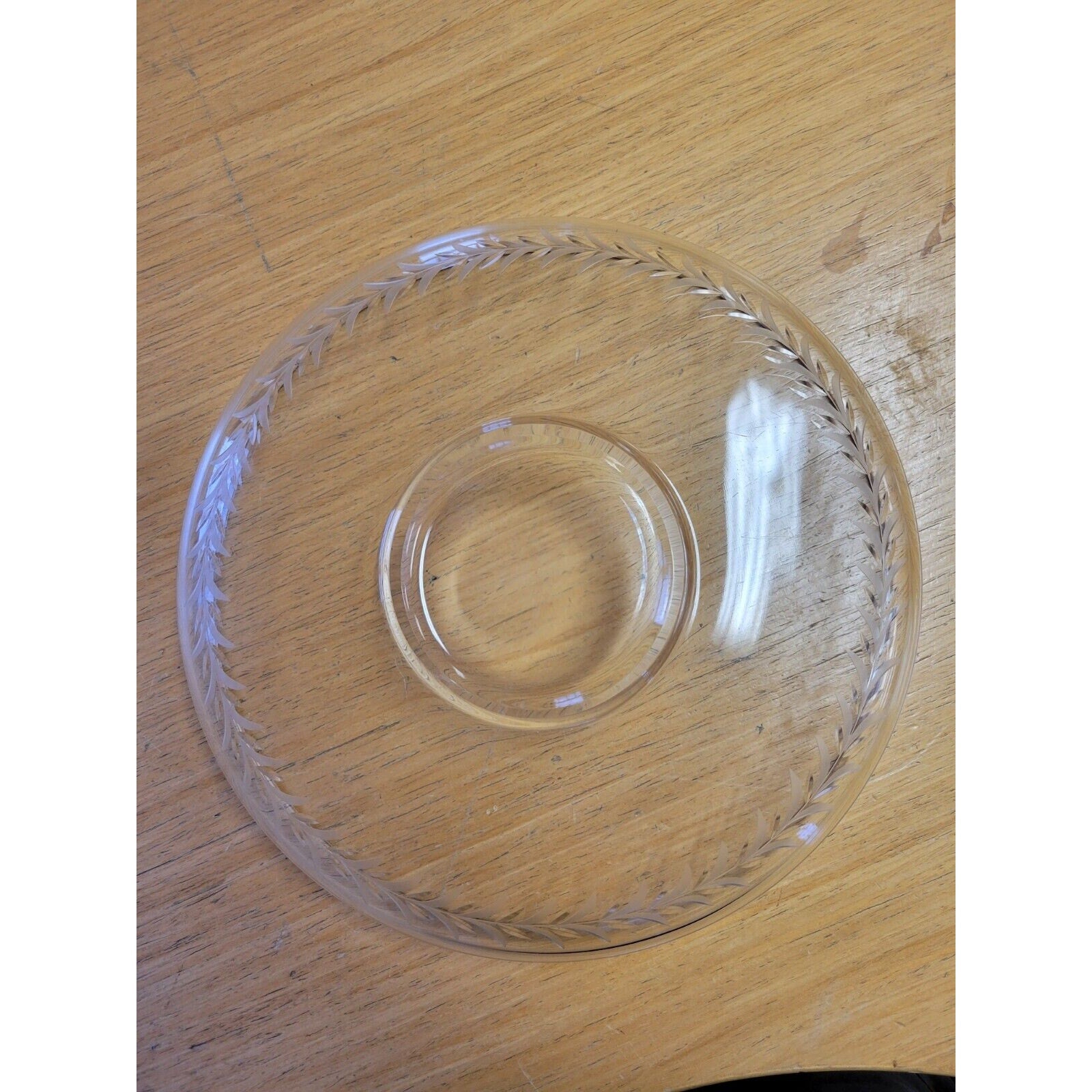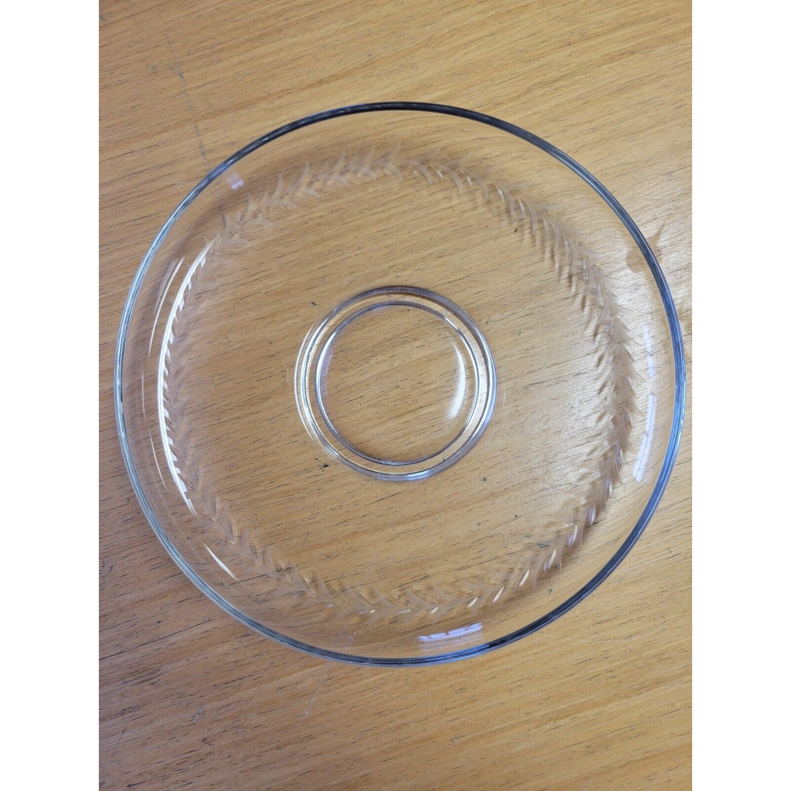 The vintage footed clear glass bowl, suitable for use as a candy or fruit bowl, features an elegant etched floral design encircling its sides. Elevated on a small pedestal foot at the bottom, this bowl combines practicality with decorative charm.