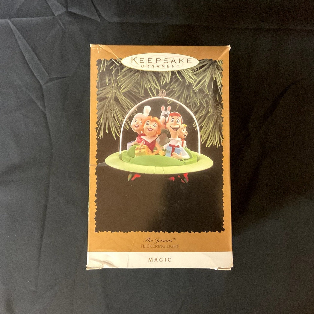 This Hallmark Keepsake Ornament, crafted in China, features a charming depiction of *The Jetsons*. Part of the esteemed *Magic* ornament collection, this delightful piece was expertly sculpted by Ken Crow. Designed to illuminate when paired with Christmas tree lights, this handcrafted ornament brings a touch of futuristic whimsy to your holiday décor. It remains in its original, unopened condition, having been briefly removed solely for photographic purposes to confirm the contents of the box. Perfect for adorning your tree, enhancing your home décor, or displaying as a collectible, this ornament is a wonderful addition to any collection.