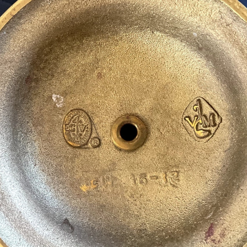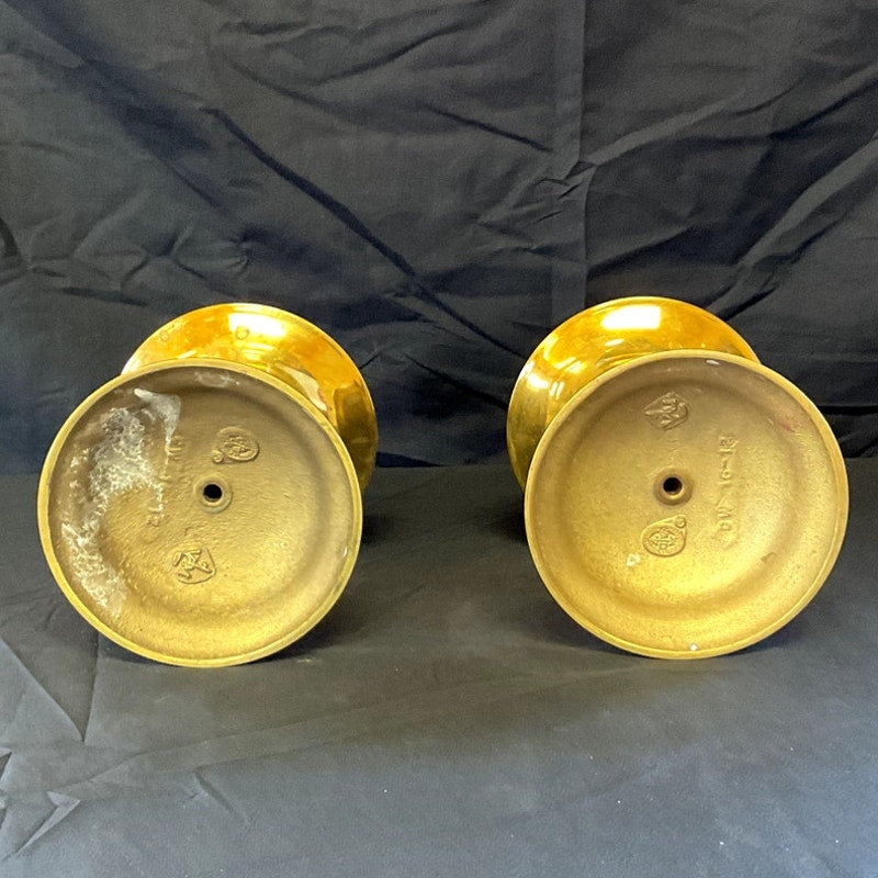 This exquisite pair of candlesticks, crafted by Jacob Von Heemskerk Dutch, boasts meticulous detailing and a striking goldish-bronze finish. Standing at a height of 8 1/2 inches with a diameter of 4 1/2 inches at the base, they are ideally suited for enhancing home decor. Each candlestick showcases intricate designs, making them a captivating addition to any interior setting.