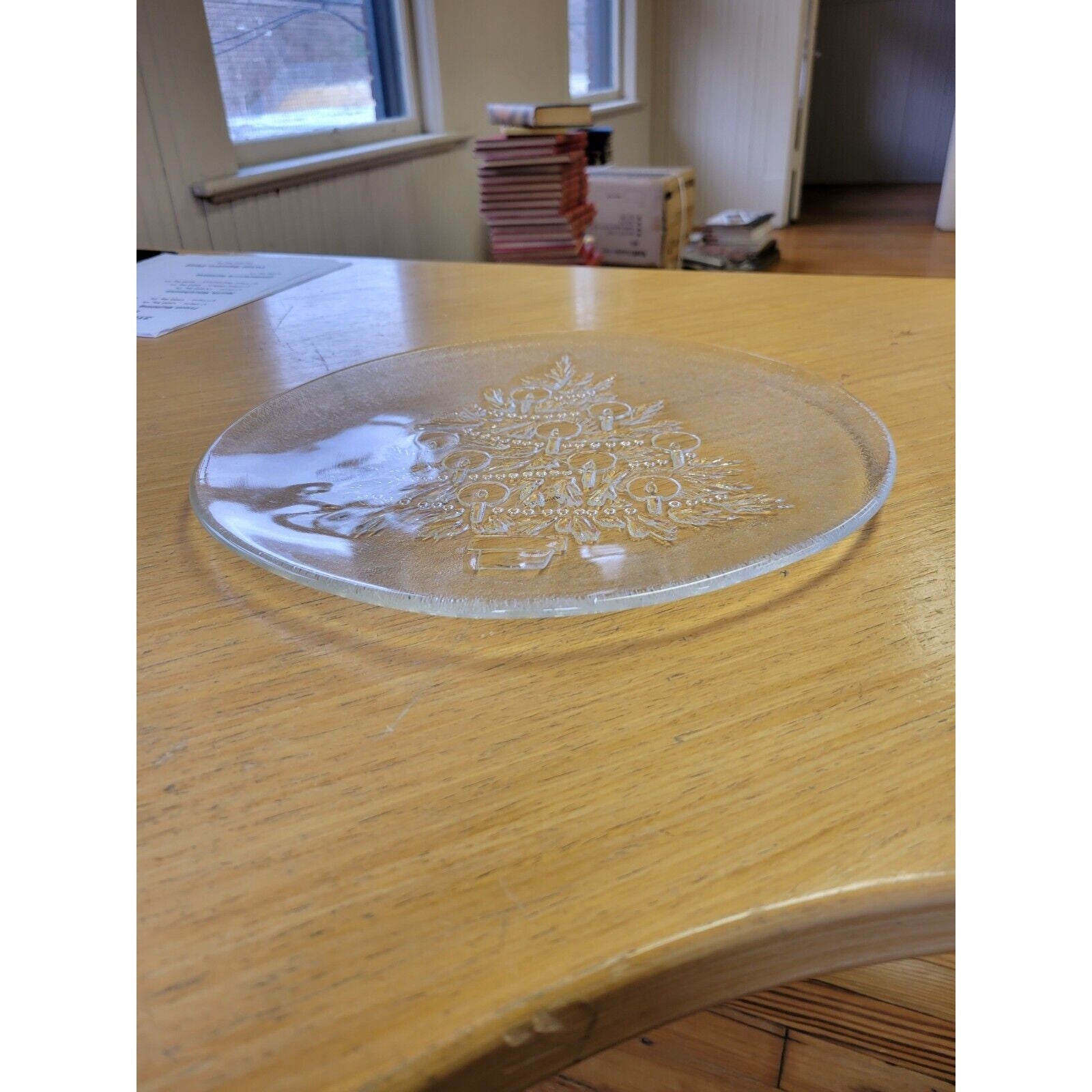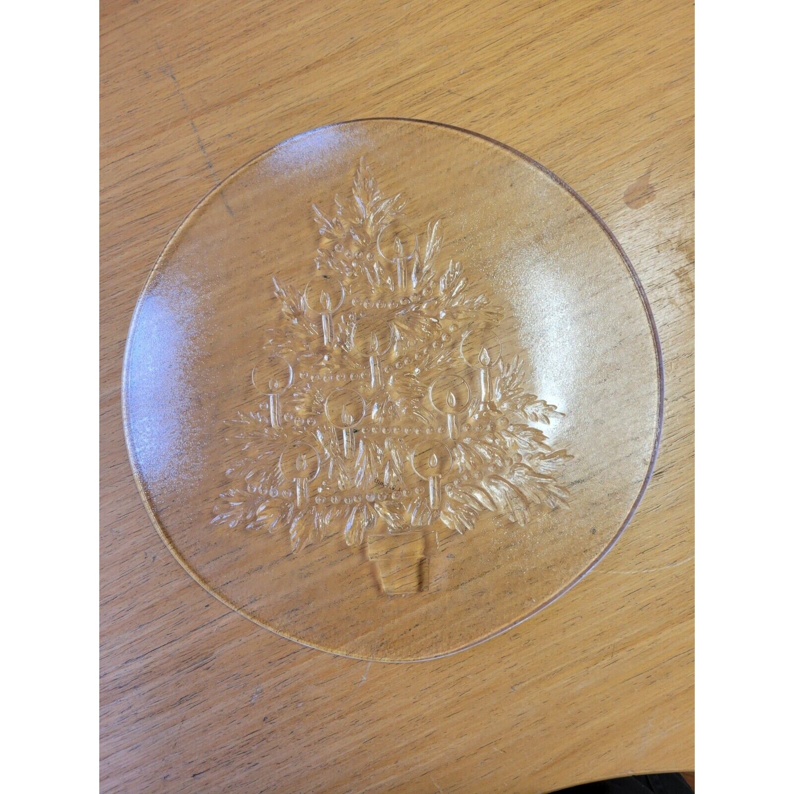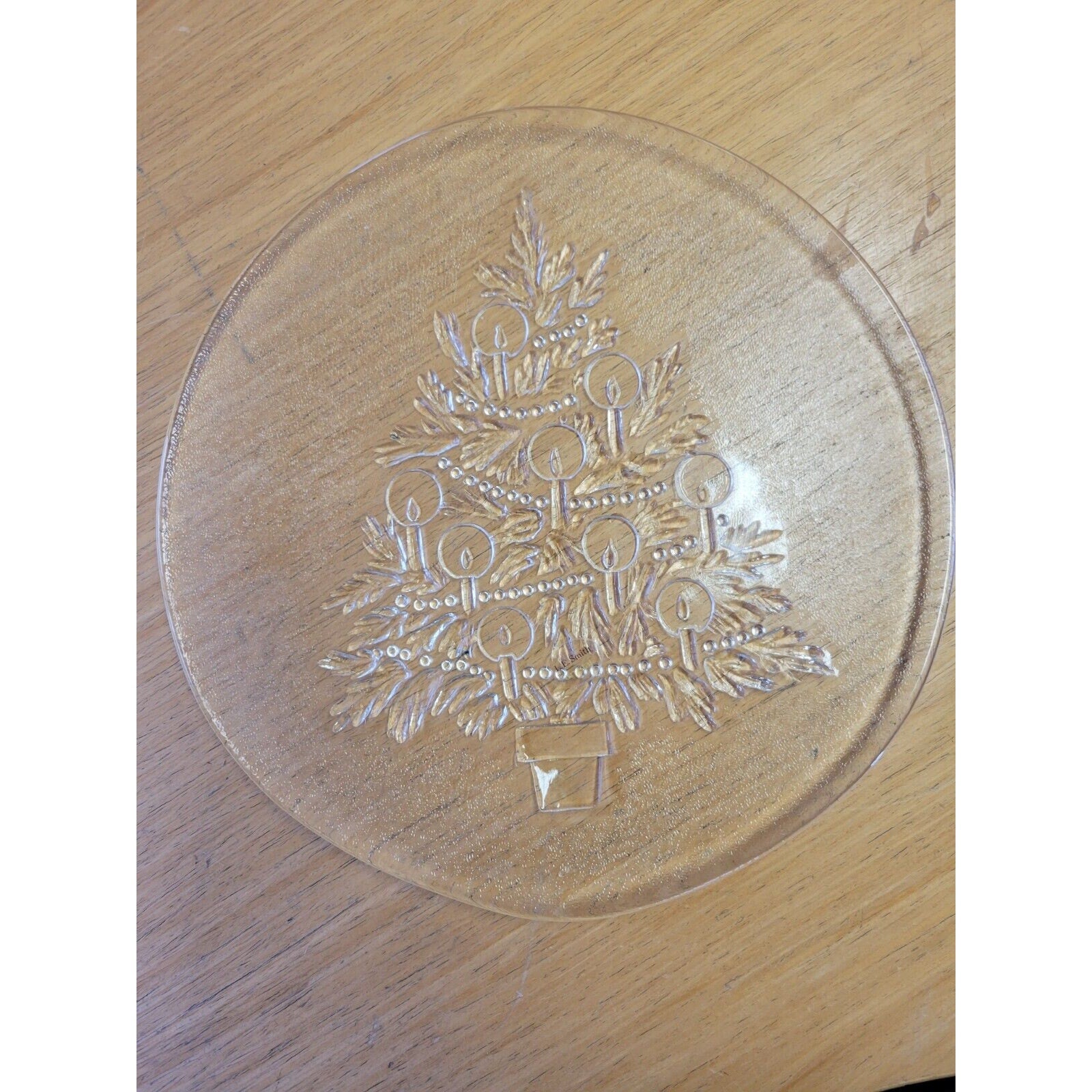 A vintage L. E. Smith crystal serving platter adorned with a Christmas tree design featuring nine candles, ideal for festive holiday celebrations.