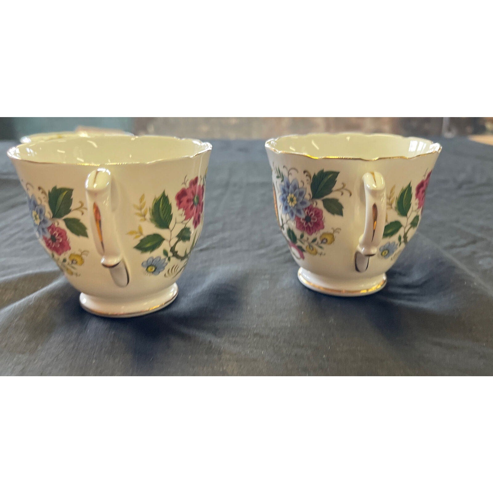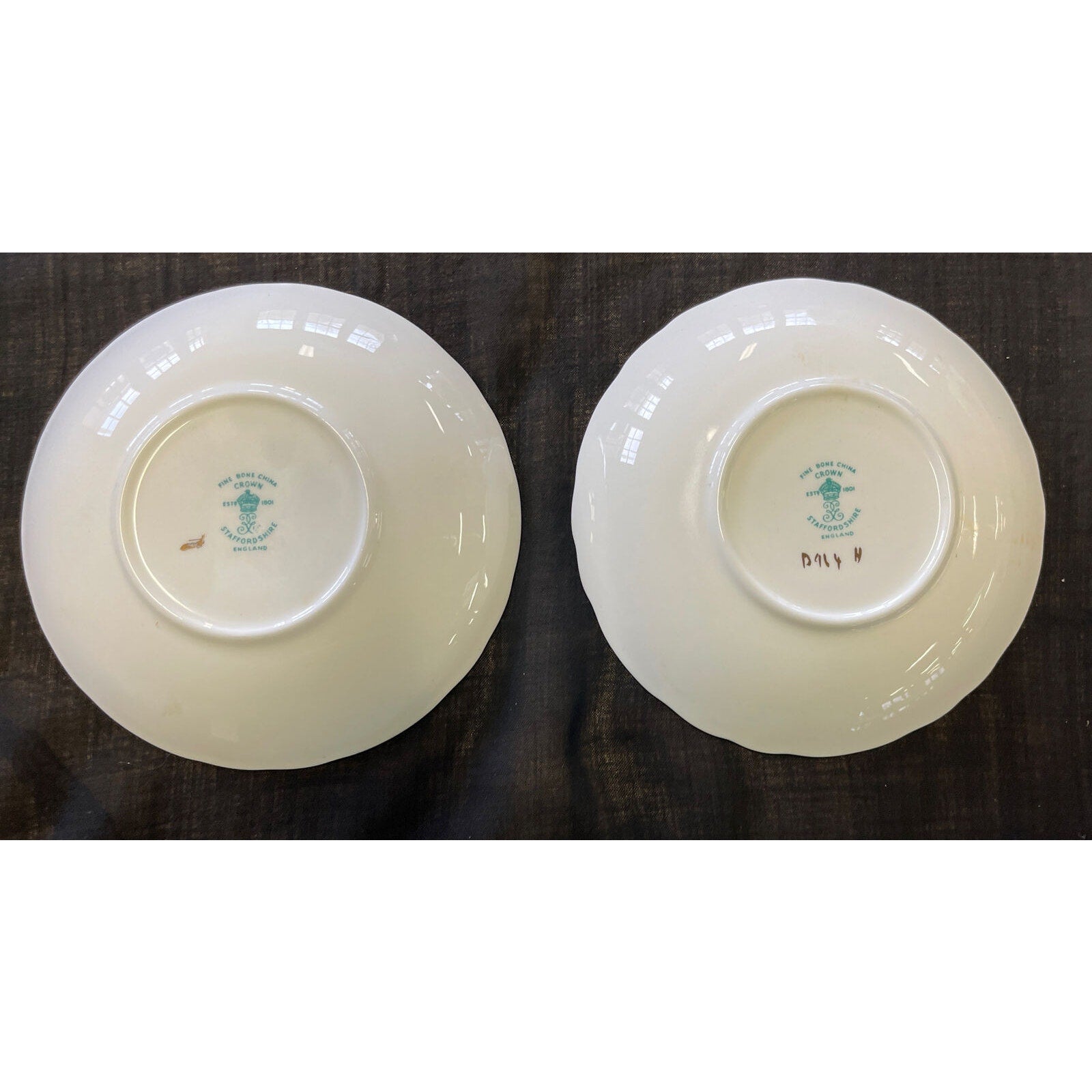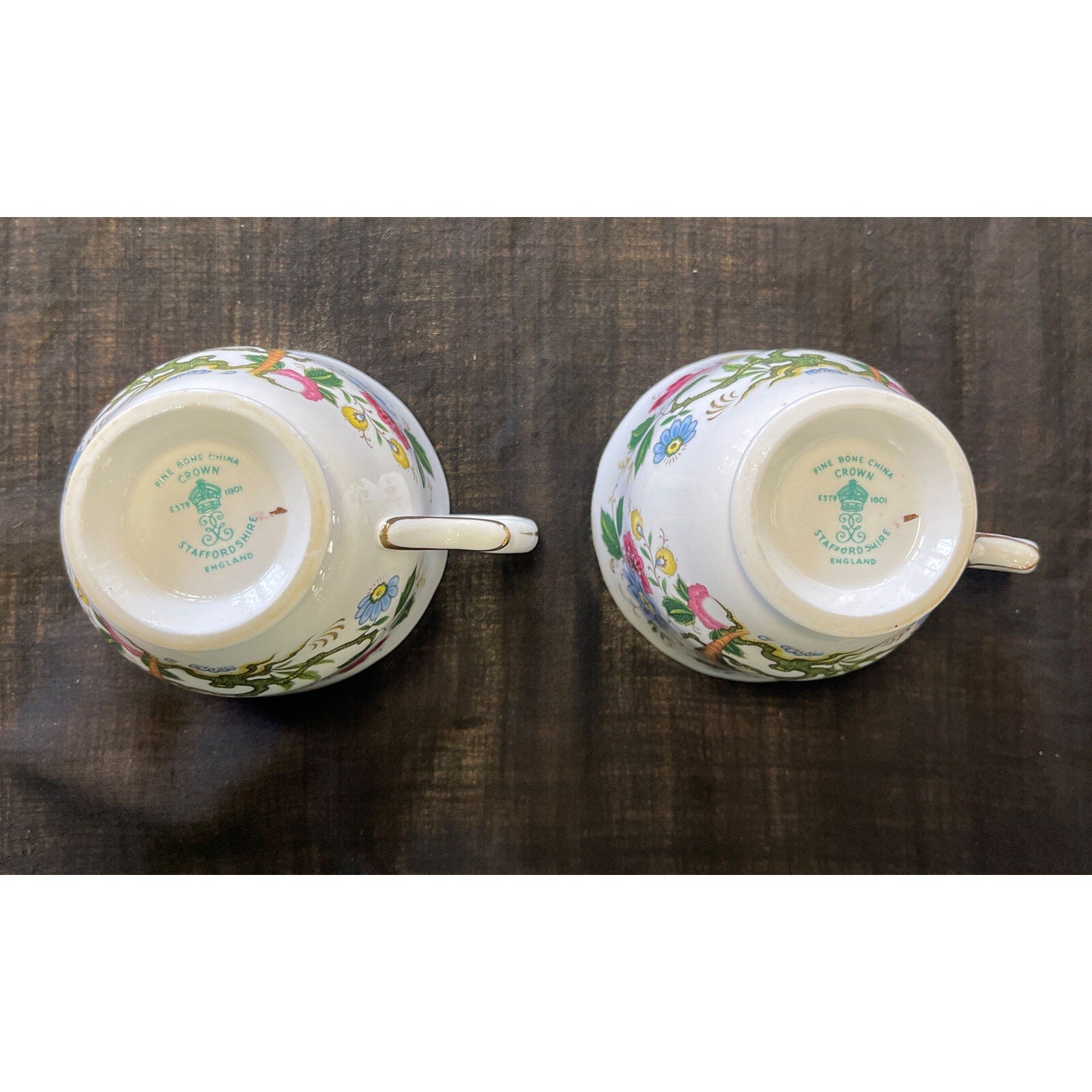 Vintage Set of 2 Crown Staffordshire Exotic Bird Coffee Cup and Saucer, circa 1930s, exemplifies exquisite craftsmanship with a gilded rim and captivating exotic bird and floral patterns. The coffee cup stands 2.75 inches tall, with diameters of 1.75 inches at the bottom and 3.25 inches at the top. The saucer boasts a diameter of 5.5 inches and a height of 1 inch. Both pieces feature an overglaze backstamp, adding to their historical authenticity and charm, making them a delightful addition to any collection of fine china.