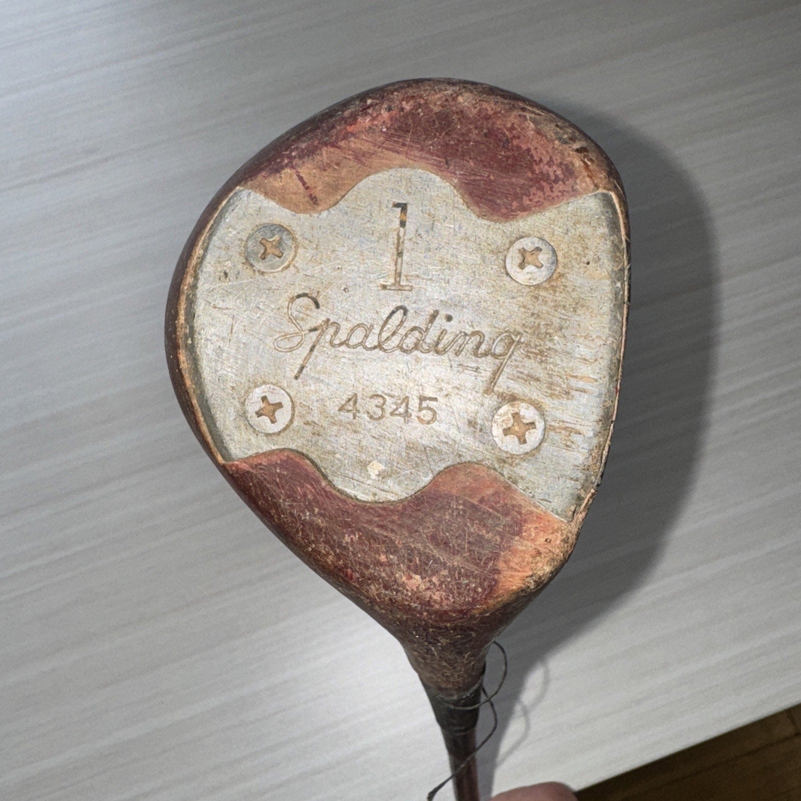 Vintage Spalding #1 wood golf club, model 4345. Right-handed men's club with classic styling and craftsmanship. The head shows minor cracking, including a visible crack at the top where it meets the shaft. The steel shaft has light oxidation but remains structurally sound. Grip is in fair condition with age-related wear. A solid candidate for restoration or display, ideal for vintage golf collectors.
