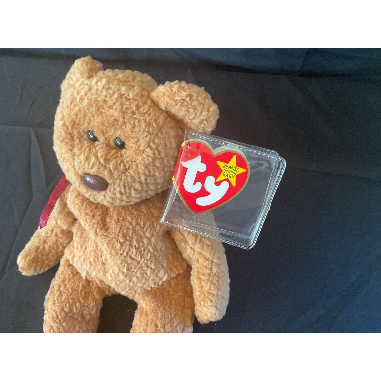 Introducing Curly the Teddy Bear, a delightful relic from the 1990s that pays homage to the nostalgic Beanie Baby era. This charming plush treasure, featuring a rare tag error, is a collector's dream. With its soft, curly fabric and a quaint ribbon around its neck, Curly embodies timeless appeal.